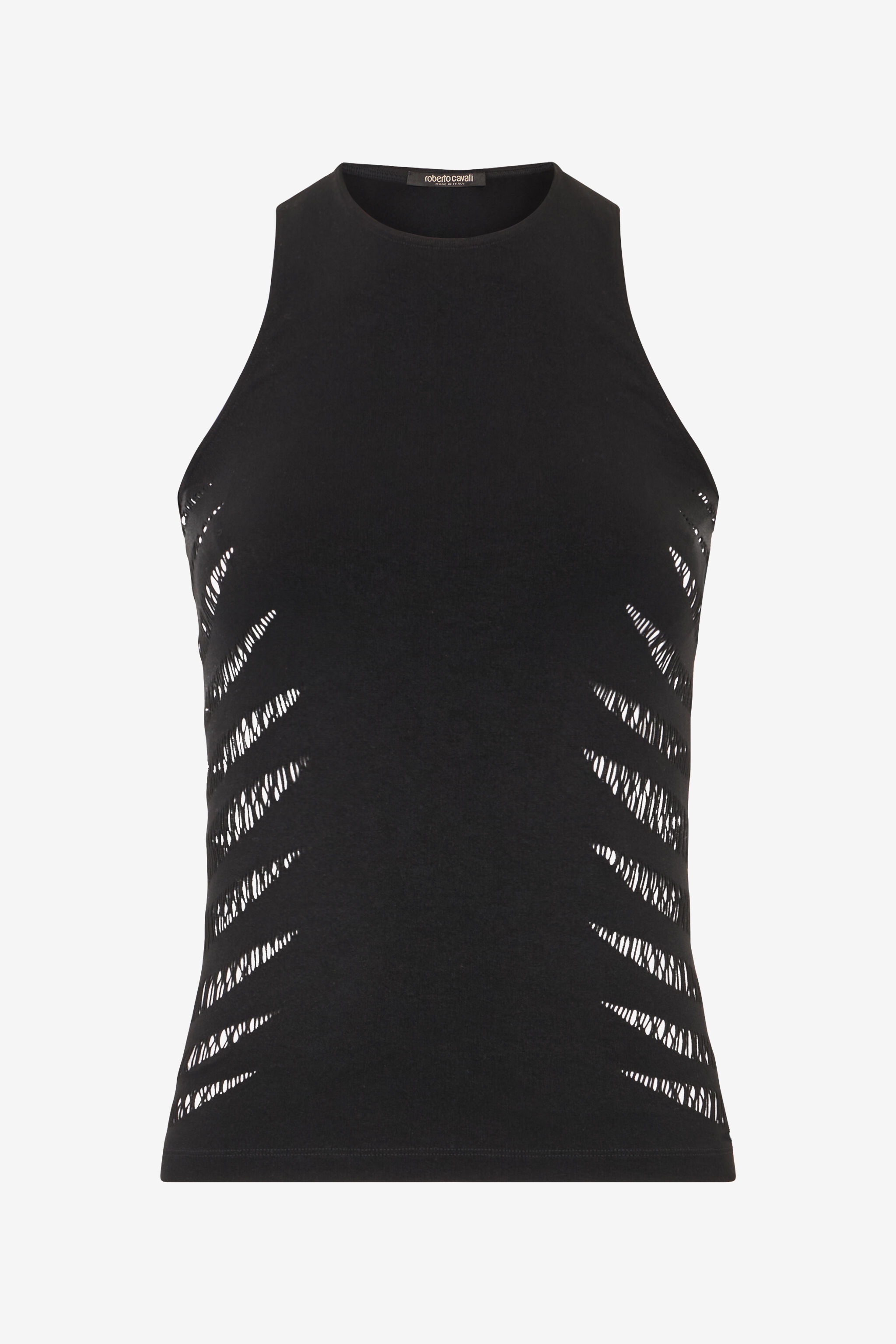 ID: UKT613-MA001-05051 A perfect combination of comfort and elegance, this Roberto Cavalli halterneck vest top features a bold openwork Zebra motif that extends along the sides of the garment, an authentic tribute to the stylistic codes that have always distinguished the Maison's aesthetics. Details - Sleeveless halterneck vest top - Crew neck - Openwork zebra design - Roberto Cavalli label on the inside collar - Made in Italy Care & maintenance External fabric:83% Polybutylene terephthalate, 17% Elastane