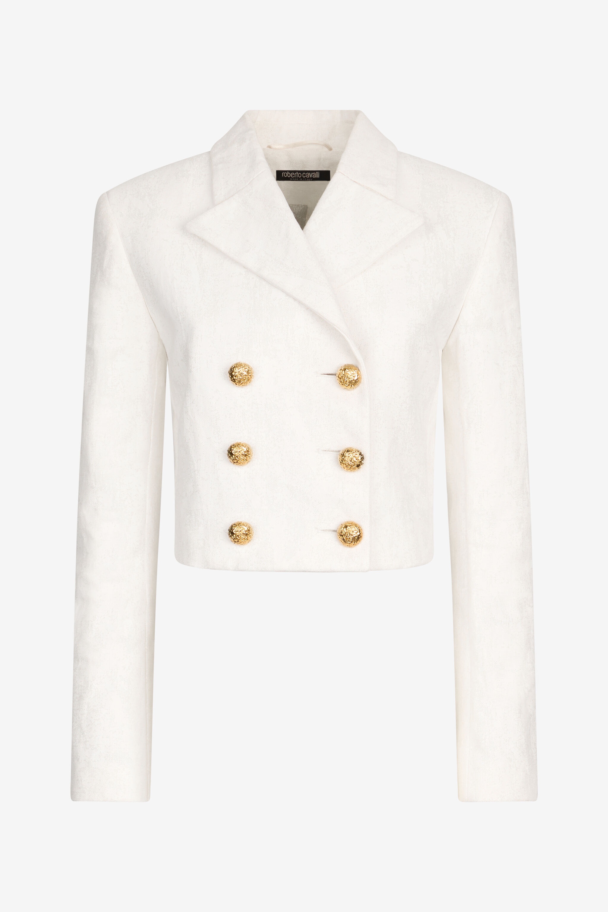 ID: UWT403-LG016-00064 An iconic garment revisited in a modern key. This Wall print cropped jacket is a symbol of elegance and style. Its sartorial line enhances the silhouette, while the golden buttons add a touch of luxury. The model is 178 cm tall and wears size S / 40. Details - Double-breasted design - Modern cropped cut - Decorative golden buttons - Made in: Italy - Perfect for an elegant daytime look or a special evening - Ideal paired with high-waisted trousers or a skirt