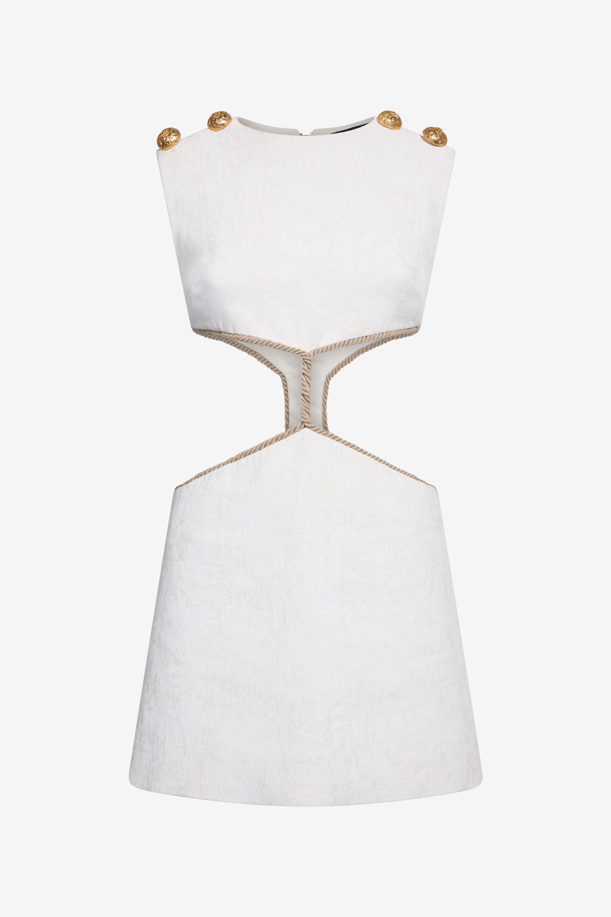 ID: UWT101-LG011-00064 This Wall print mini dress is a bold and refined piece. The side cut-outs add a touch of sensuality, while the golden buttons on the shoulders confer a timeless elegance. Perfect for those who want to dare with style. The model is 178 cm tall and wears size S. Details - Side cut-out design - Zip closure on the back - Decorative golden buttons on the shoulders - Made in: Italy - Ideal for evening events or special occasions - A-line fit