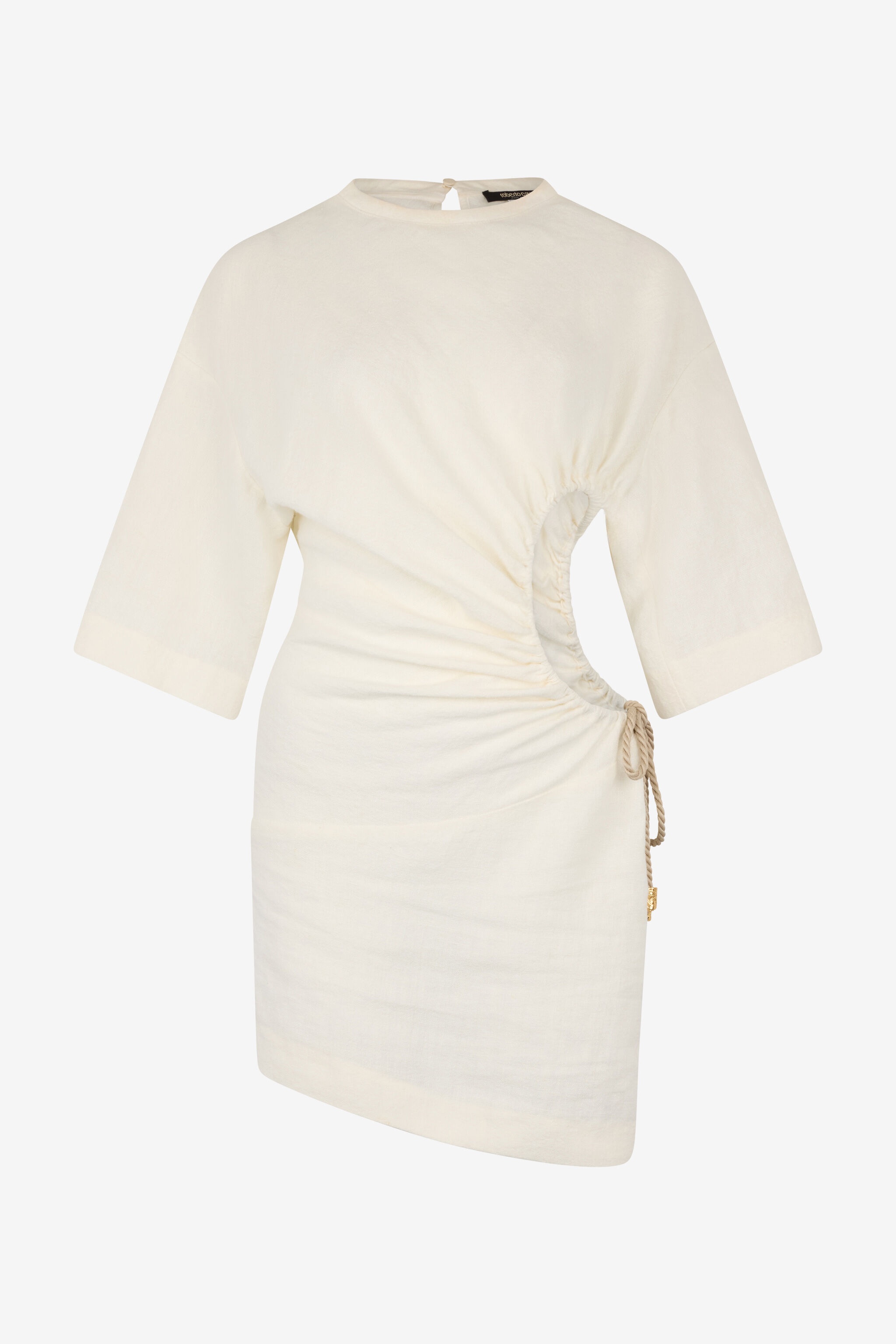 ID: UWT131-LG018-00064 A short dress that celebrates the feminine silhouette with a touch of bold elegance. The exclusive Wall print captures the eye, while the side cut-out, emphasized by the drawstring, adds an element of surprise. The model is 178 cm tall and wears size S/40. Details - Design with side cut-out and adjustable drawstring - Short sleeves and minimalist line - Invisible zip closure on the back - Made in: Italy - Ideal for evening events or special occasions - Perfect paired with jeweled sandals and a clutch Care & maintenance External fabric:100% Flax / Secondary fabric:75% Acetato, 25% Silk