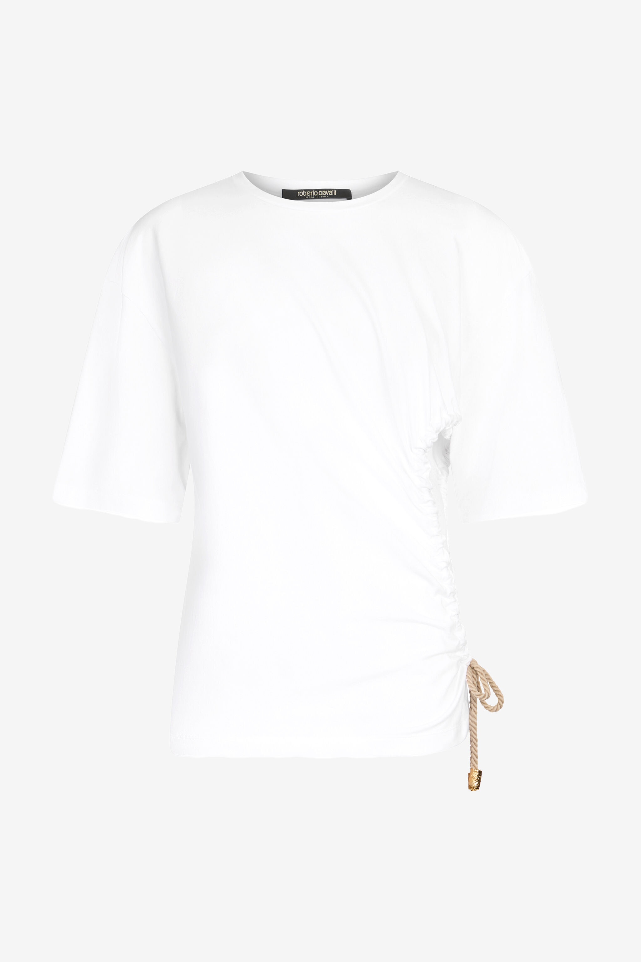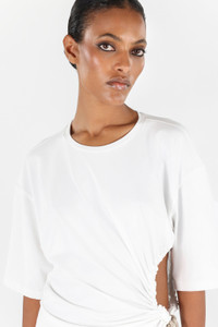 ID: UWT605-JD015-00064 A reinterpretation of a classic basic, this white cotton jersey t-shirt features a decorative side knot that adds an unexpected touch. Perfect for a casual-chic look. The model is 178 cm tall and wears size S / 40. Details - Design with adjustable side knot - Classic crew neck - Short and wide sleeves - Made in: Italy - Ideal with palazzo pants or long skirts - Perfect for creating a layered look with blazers and jackets