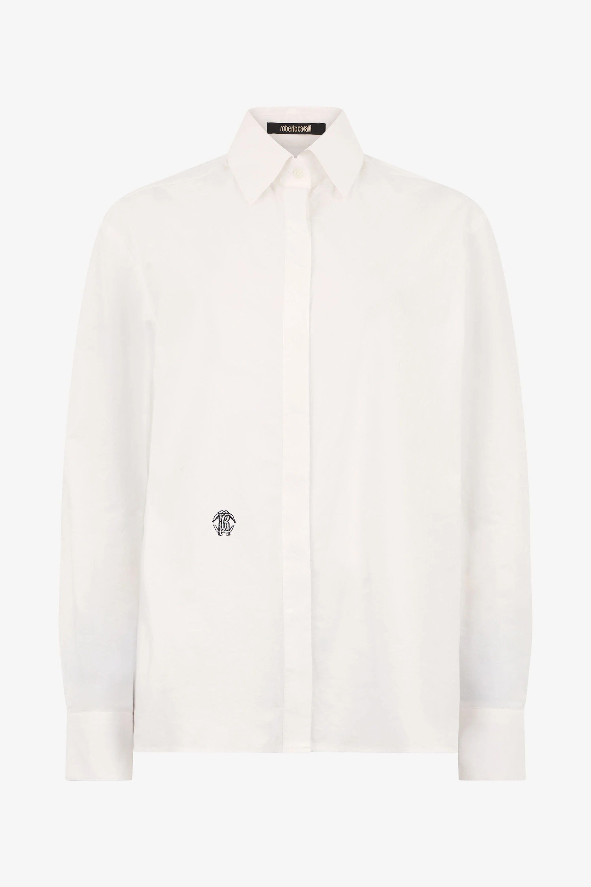 ID: PST71U-SY010-00053 An icon of timeless style, this pure cotton shirt is an essential piece for the contemporary wardrobe. Its clean, classic silhouette is subtly elevated by the embroidered Monogram RC, a discreet yet unmistakable symbol of Roberto Cavalli's refined aesthetic. A versatile garment that promises effortless elegance for any occasion. The model is 178 cm tall and wears size S / 40 IT. Details - White cotton shirt - Classic pointed collar - Embroidered Monogram RC on the left side - Front button fastening - Long sleeves with buttoned cuffs - A timeless essential, perfect for adding a touch of elegance to any daytime or evening look. - Style with tailored trousers or a leather skirt to complete the outfit. Care & maintenance External fabric:100% Cotton