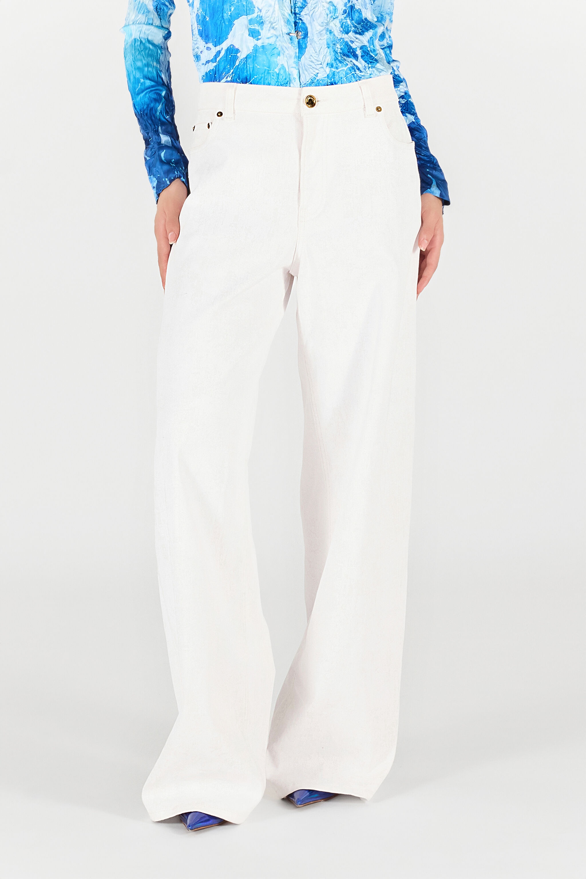 ID: UWJ207-DE007-00052 These denim trousers offer a relaxed and sophisticated silhouette. The wide leg cut creates a modern and trendy look, perfect for those seeking a versatile and high-quality garment. The model is 178 cm tall and wears size S / 40. Details - Classic five-pocket design - Front closure with zip and button - Belt loops at the waist - Made in: Italy - Perfect for a casual-chic or elegant evening look - Ideal with a shirt or a t-shirt