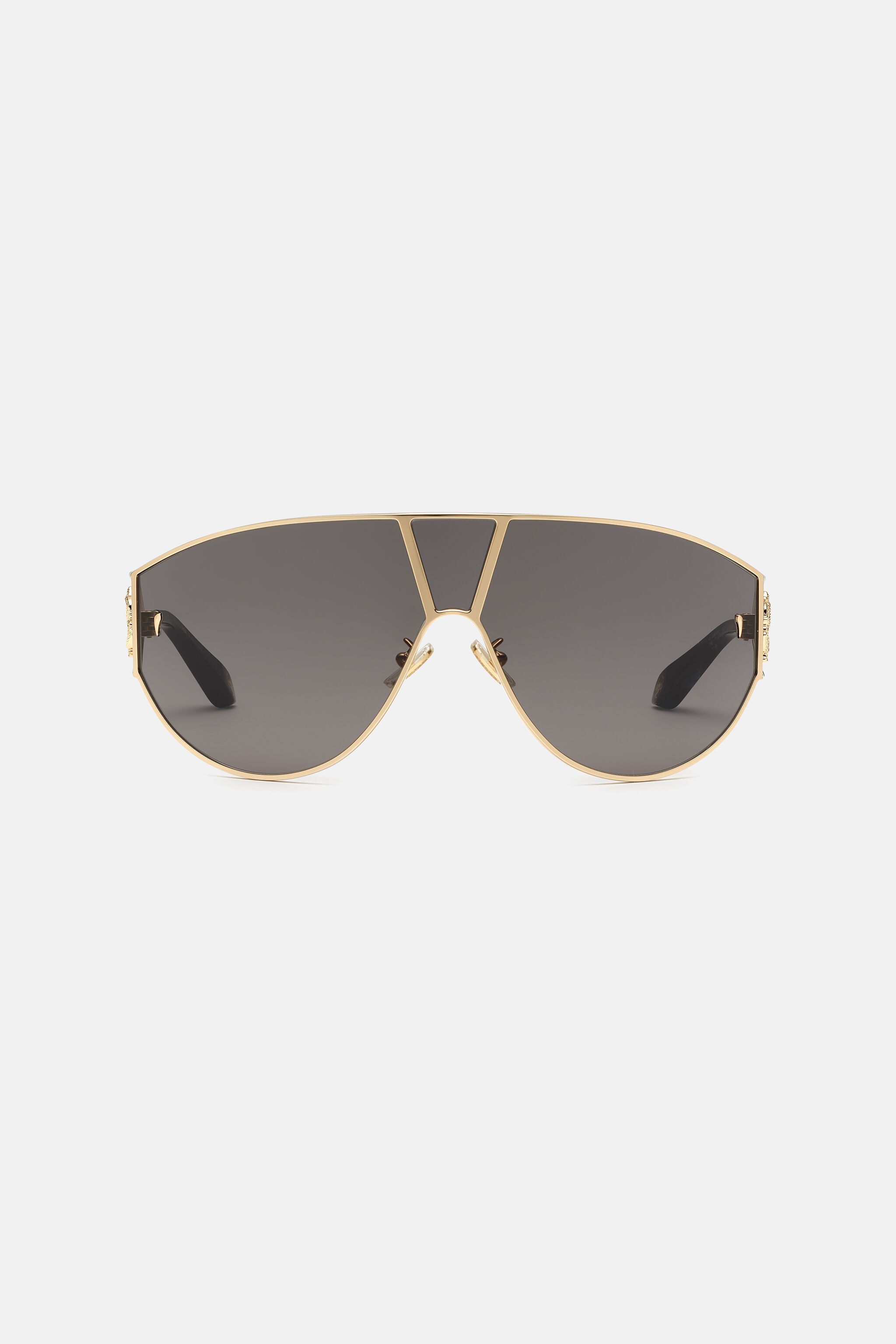 ID: ALD027-ID185-E0340 Wide mask, unisex. The lens is wrapped and it is the protagonist of the front, embellished with two small fangs. Mirror snake logo, snake skin detail on the temples. Details - Sunglasses Roberto Cavalli - Mirror snake Collection - Temples with snake skin details on the temples - Made in italy - Lenses 76mm Bridge 11mm Temples 125mm - ID: SRC093760300 Care & maintenance Composition:Nichel, Polybutylene terephthalate, Acetato