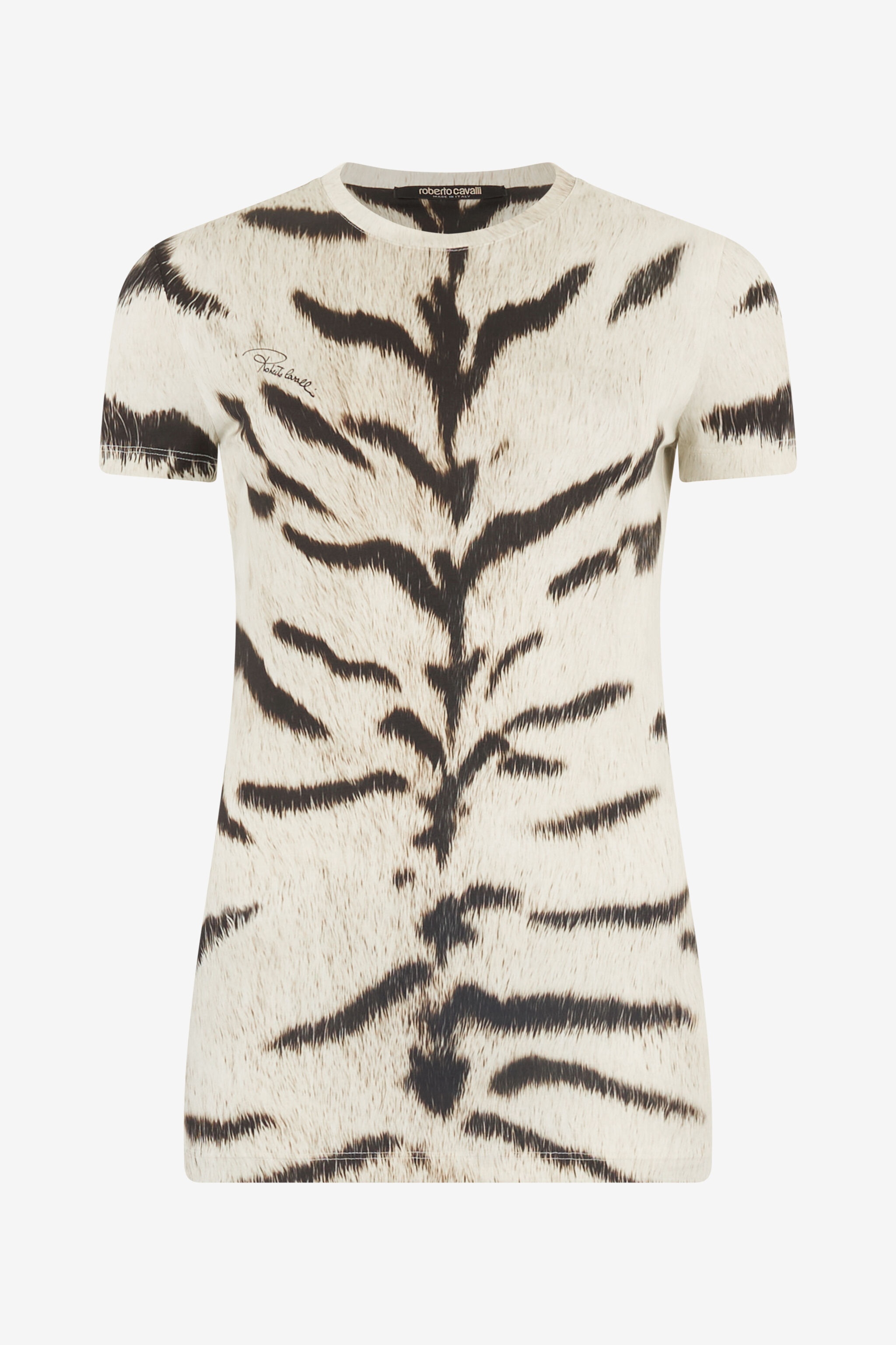 ID: UQT67A-3DA39-D0027 A collaboration between Roberto Cavalli and OGAT, a brand dedicated to responsible and sustainable fashion, has led to the creation of a leisurewear capsule comprising four distinct designs, available on demand and entirely crafted in Italy using soft, organic cotton. This short-sleeved crew-neck T-shirt with a fitted silhouette exudes a dynamic yet sensual look, accentuated by the White Tigresse motif, the common thread throughout the entire collection: this animal print, created using innovative waterless technology that applies eco-friendly ink only where necessary, not only pays tribute to the feline world but also serves as a true testament to the Maison's commitment to more sustainable fashion. The design is finished with the iconic RC Monogram that decorates the chest. Details - T-shirt with White Tigress print - Tight cut - Crew neck - Short sleeves - RC Monogram on the chest - Made in Italy - The garment is made of organic cotton for a sustainable choice and is part of the capsule collection created in collaboration with OGAT