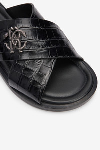 ID: VMS001-PZ037-05051 Designed for the modern man, this black leather sandal exudes timeless elegance. The crocodile-effect texture and refined metallic details add a distinctive touch. Perfect for adding a hint of luxury to casual summer looks. Details - Black leather with crocodile effect - Distinctive metallic details - Open and comfortable design Care & maintenance Lining:100% Bos Taurus / Outer sole:100% Bos Taurus / Upper:100% Bos Taurus
