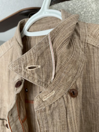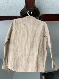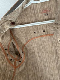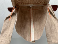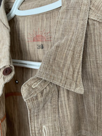 Here we have a beautiful 100% cotton chambray workshirt from Sunny Sports, out of Japan. The weave is made up of threads varying in shades of brown and ecru, giving the shirt a lot of depth and character. It’s tagged size 36, which is somewhere between XS-S in my opinion. I’d say it would fit someone who is normally an XS, but has a bit of a pandemic belly, as there is a bit of “workshirt room” in the mid-section. It’s fairly lightweight, but not so that it sacrifices durability. It’s a well made shirt, perfect for spring/summer. It’s been worn very minimally, still in 9/10 condition. I just personally prefer a slimmer fit through the body, even for a work-shirt. Details: * Selvedge side-seam gussets and collar-points (hidden, pictured). * Button-down collar (hidden buttons). * Contrasting orange chainstitch threading, with run-off. * Double and triple-needle stitching throughout. * Symmetrical chest pockets, with single button closure, rare option on these, which give it a slightly dressier look. * Reinforced chest pocket corners. * Extra material sewn into the inside of placket and cuffs, for strength and durability * Scalloped yokes (WHAT?!) for durability. * Scalloped hem, allowing you to move, sit, and put your hands in your pockets without bunching up the shirt front. * Ventilation holes under the arms and along the back yoke to keep you cool. * Cat’s eye buttons throughout * Logo and size printed on the inside of the back yoke. Measurements: Chest - 20” Shoulders - 16.5” Length - 27” Sleeve from Shoulder - 23.5” Any questions or trade offers, get at me.
