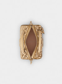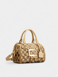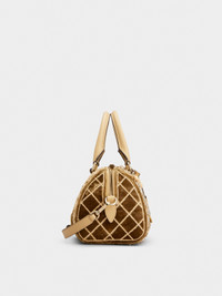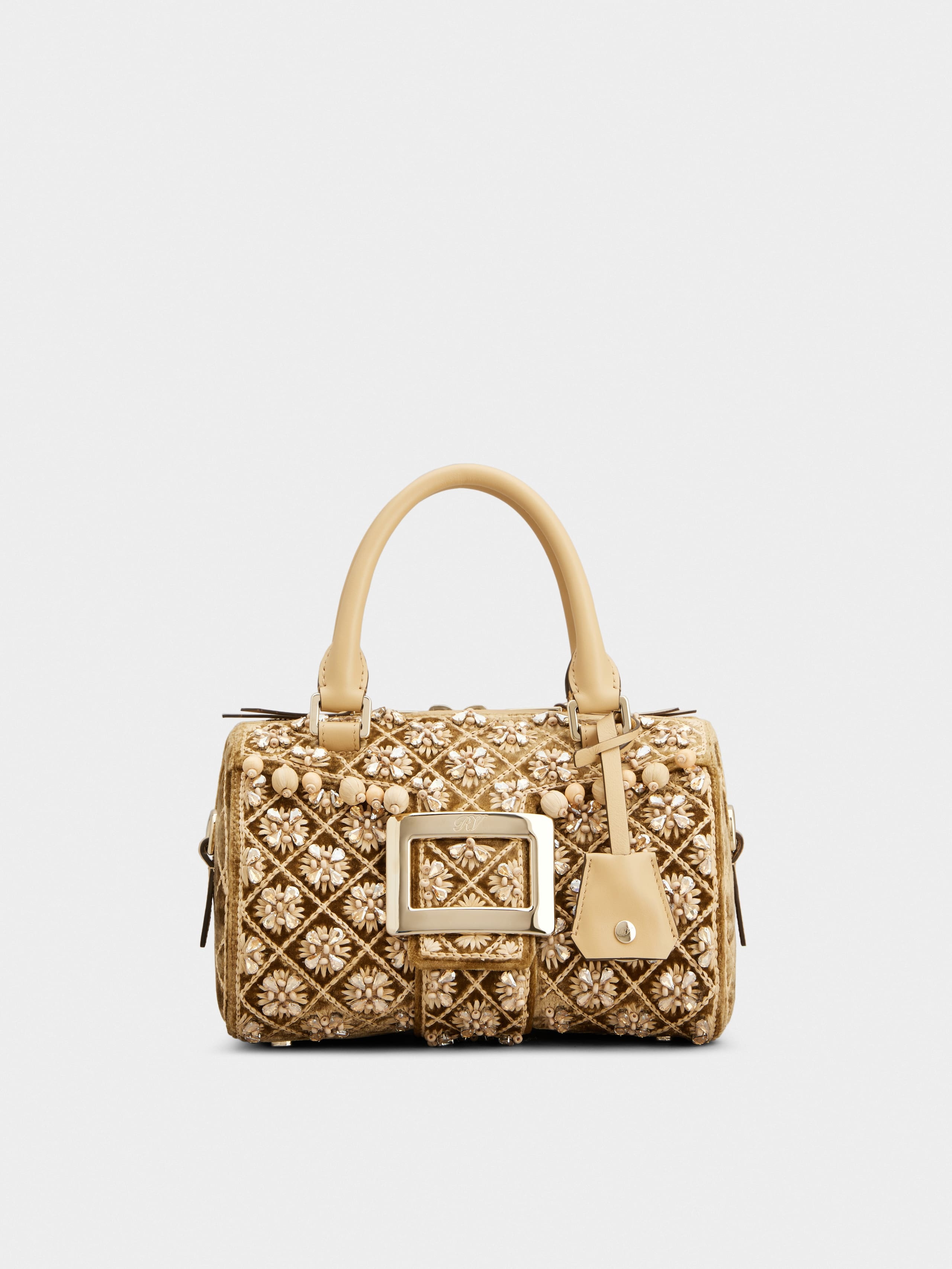 Created in 1965, the Belle Vivier buckle is an emblem of elegance and femininity. Its sophisticated and timeless allure is expressed in this bag in velvet and leather, with raffia, bead and crystal embroideries. Featuring two handles and a removable shoulder strap, it is embellished with a pendant with key ring. A synthesis of classic and contemporary in a refined proposal. Description & details Dimensions: L 8.3 ins x H 5.1 ins x D 5.1 ins Velvet and calfskin leather Raffia, bead and crystal decorations Fixed handles Adjustable and removable shoulder strap Metal buckle Removable pendant with key ring Double-slider zip closure Fabric lining Internal pocket Feet Made in Italy Mod: RBWAPAH8100UNA378S