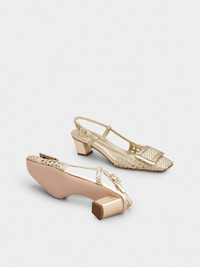 Launched in 1965, the Belle Vivier is one of the Maison's most famous designs. Becoming an icon thanks to its buckle and Skyscraper heel, its reinterpretations make it a new classic. Crafted in leather with a woven detailing, these slingback pumps are the perfect ally of your days. Description & details Goatskin, ovine leather Calfskin leather inserts Metallic finishing Metal buckle Heel strap Leather insole Leather outer sole Covered Skyscraper heel Heel height 1.8 ins Made in Italy Mod: RVW00643130UN91S43