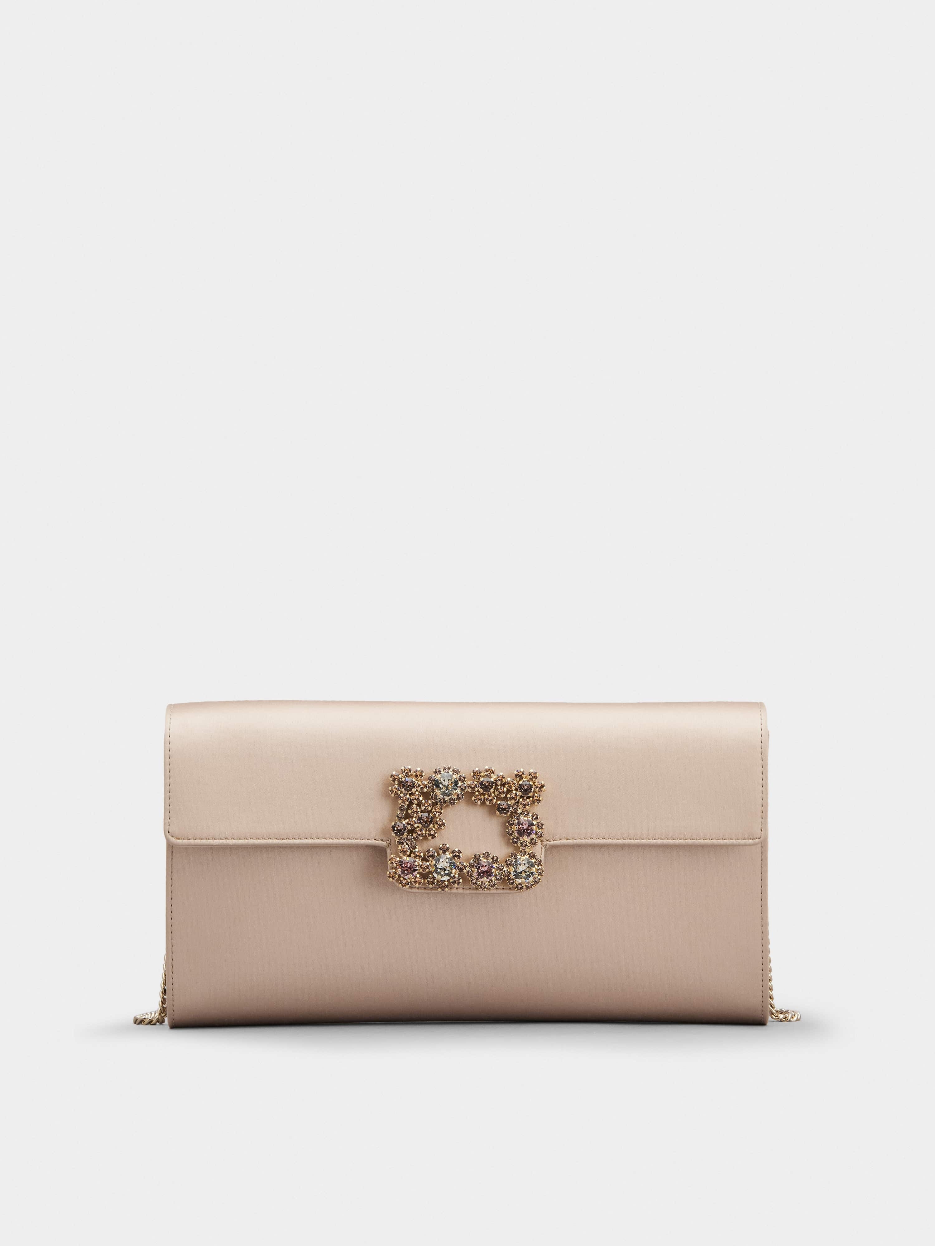 The Flower Buckle in multi-colored gemstones give a subtle hint of fun to this exquisite satin clutch with a thin metal chain strap - a precious accessory for grand occasions. Description & details Made in Italy Item crafted in satin Flower Buckle in rhinestones Dimensions: 9.5 x 5.2 x 1.4 ins, metal chain strap approx 41.3 ins Maintenance and care cards included Branded dustbag Mod: RBWAMFD0200RS0M014