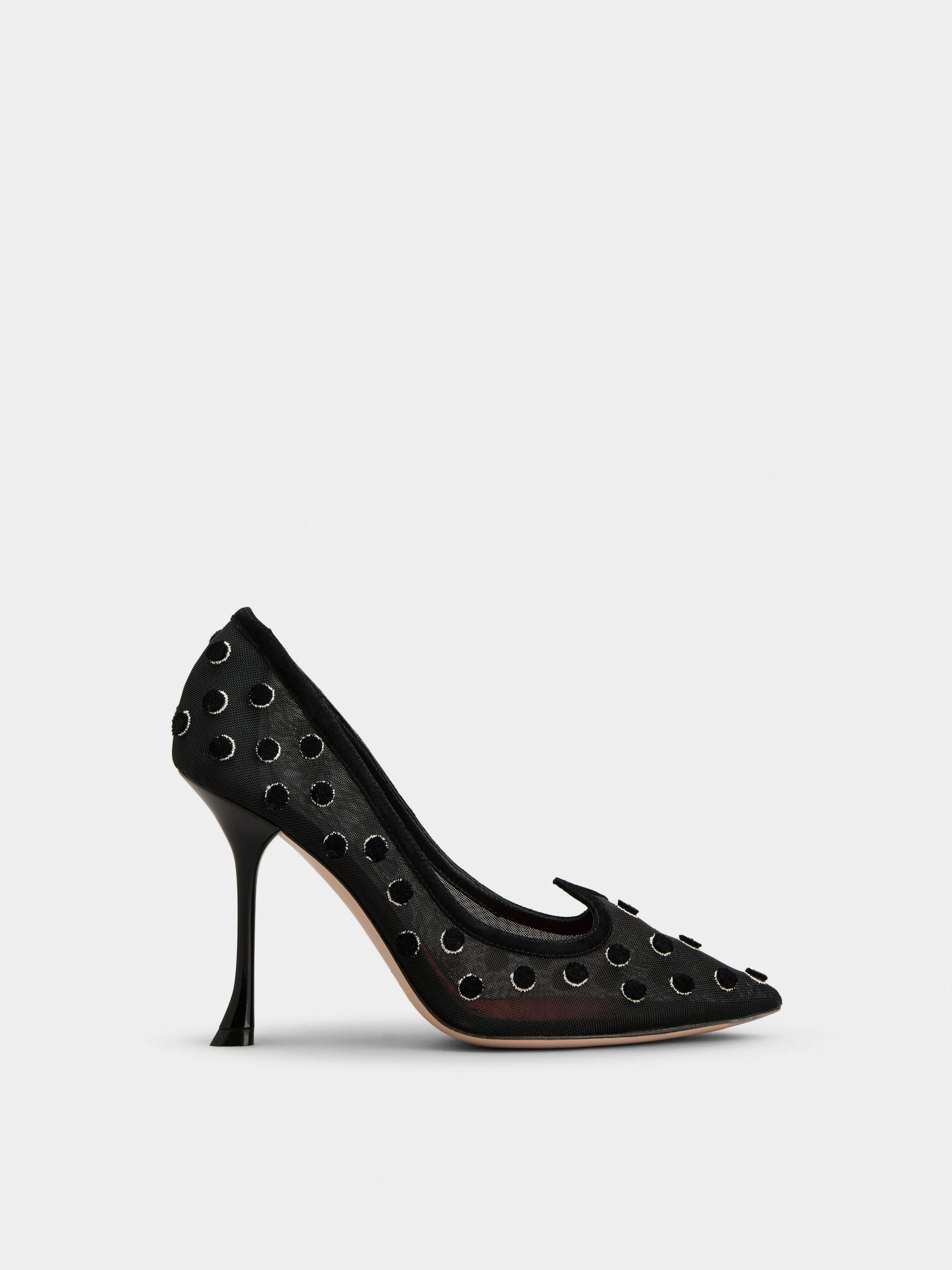 The I Love Vivier collection, celebrating the theme of love, takes on a polka dot pattern, with a play of refined transparency. Crafted in mesh fabric and suede, these pumps are characterized by the heart-shaped silhouette that peeks out from the insole and defines the outline of the top edge. With their elegant and distinctive silhouette, they express a contemporary allure, under the sign of joie de vivre. Description & details Mesh fabric Velvet and lurex polka dots Suede piping Leather insole with heart-shaped insert Leather outer sole Lacquered stiletto heel Heel height 3.3 ins Made in Italy Mod: RVW53844400V38B999