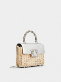Characterized by a shiny crystal buckle, this clutch is crafted in metallic leather and hand-woven rattan. Featuring a finely decorated jewelled handle, it comes with a concealed metal chain strap. A timeless aesthetic accessory, with a sophisticated summer look. FEATURES - Dimensions: L 7.5 ins x H 4.7 ins x D 2.4 ins - Leather and rattan - Metal handle with rhinestones - Metal chain strap - Crystal buckle - Magnetic button closure - Leather interior - Internal pocket - Feet RBWAMFC2100UCN4093