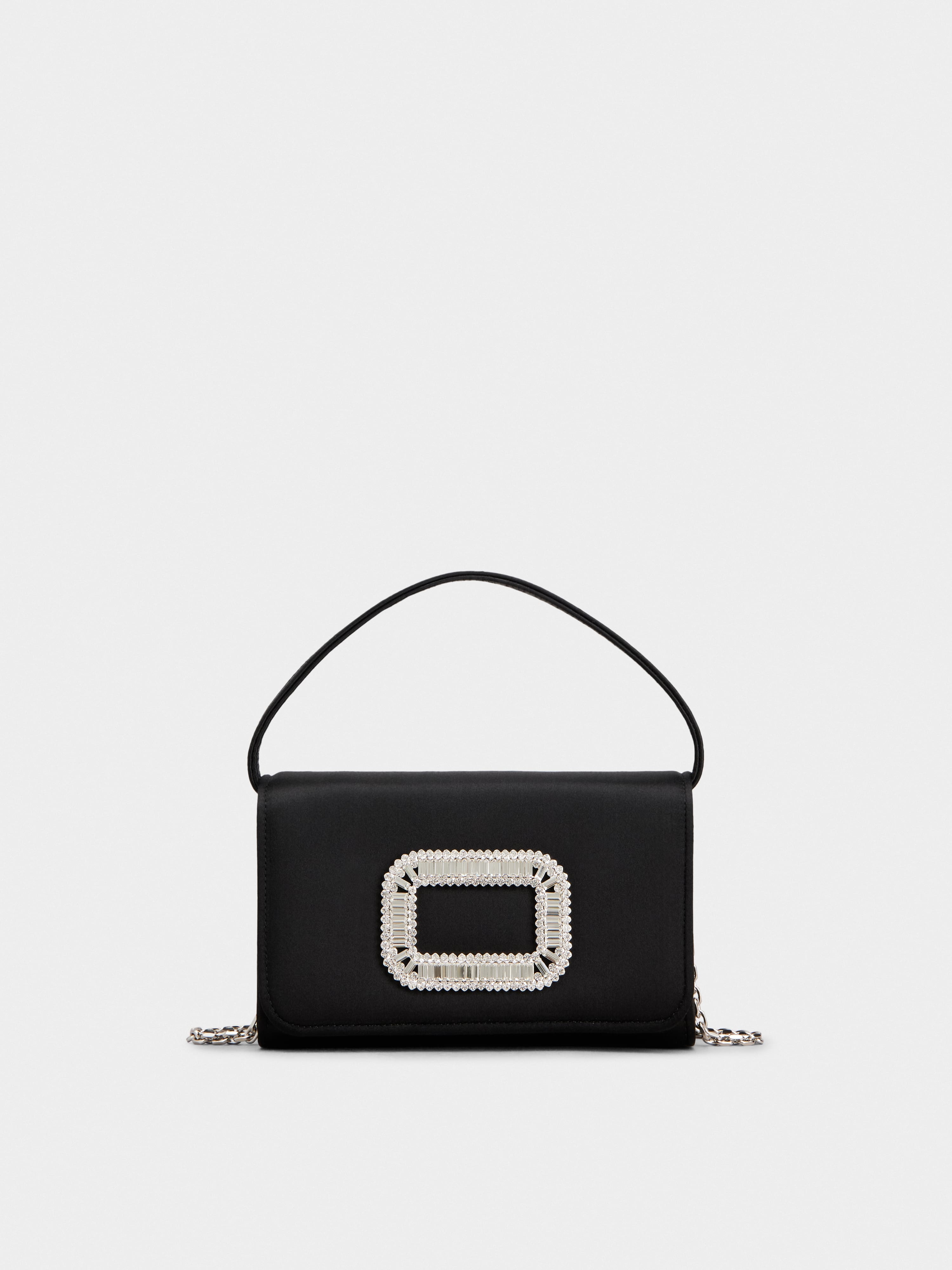 The iconic Pilgrim buckle is adorned with baguette crystals that give it all its sparkle. The crystals are applied by hand, using a high jewelry technique. This micro bag in satin, with a removable metal chain, ensures elegance for any occasion. Description & details Dimensions: L 7.1 ins x H 4.1 ins x D 2.4 ins Silk blend satin Fixed handle Removable metal chain Crystal buckle Magnetic button closure Internal pocket Made in Italy Mod: RBWABDH0000RS0B999