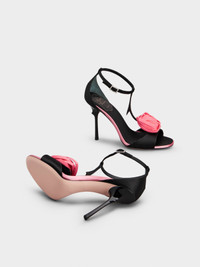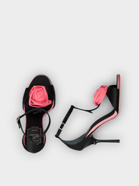 Delicate yet bold, romantic yet proud, the rose embodies femininity. Born in 1965, a symbol dear to Monsieur Vivier, it is reborn in a revisited thorn heel and refined floral embellishments: sculpted rosebuds and twisted volutes. The Rose Vivier is one of the House's most bewitching emblems and adorns these sandals. Characterized by an alluring lacquered heel, they are crafted in satin with T-strap at the ankle. FEATURES - Silk blend satin - Satin fabric inserts - T-strap at the ankle - Satin insole - Leather outer sole - Lacquered heel - Heel height 3.9 ins - Made in Italy RVW79743730UVM89ID