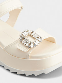 Characterized by a covered wedge, these sandals in nappa leather are adorned by a crystal buckle. Featuring the emblematic heart-shaped insole, this practical summer style compelements the urban look with a distinctive Vivier touch. Description & details Ovine nappa leather Crystal buckle Ankle strap with velcro Leather insole with heart-shaped insert Leather covered wedge Rubber outer sole Made in Italy Mod: RVW7754239091TC019