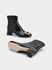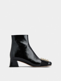 Reminiscent of the Sixties, the Tres Vivier style has become an icon, sophisticated and comfortable at once thanks to the geometric heel. Crafted in patent leather, these booties come with a shiny crystal buckle. FEATURES - Patent leather - Crinkled effect finishing - Crystal buckle - Zip on the inside - Leather insole - Leather outer sole - Geometric heel - Heel heigh 1.8 ins - Made in Italy RVW51940550TM6B999