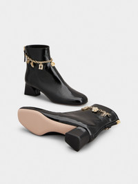 Reminiscent of the Sixties, the Tres Vivier style has become an icon, sophisticated and comfortable at once thanks to the geometric heel. Crafted in patent leather with a zip on the back, these booties are adorned by a chain with branded charms. Description & details Patent calfskin leather Metal charms Crystal detailing Zip on the back Leather lining and insole Leather outer sole Covered geometric heel Heel height 1.8 ins Made in Italy Mod: RVW76543630TM6B999