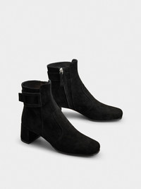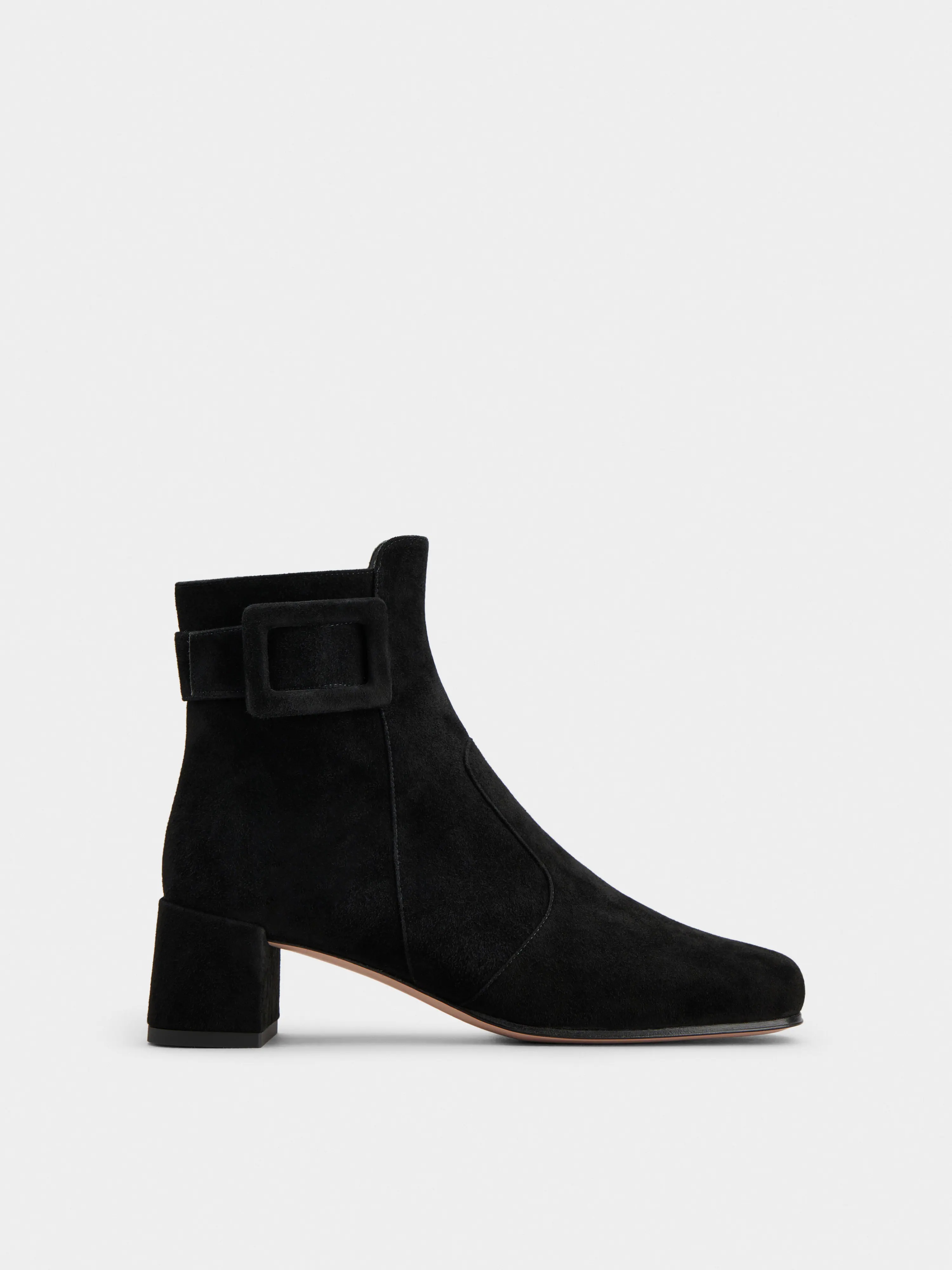 Reminiscent of the Sixties, the Tres Vivier style has become an icon, sophisticated and comfortable at once thanks to the geometric heel. Crafted in suede, these booties come with an elegant covered buckle. Description & details Suede (goatskin leather) Covered side buckle Zip on the inside Leather insole Leather outer sole Covered geometric heel Heel height 1.8 ins Made in Italy Mod: RVW75140570HR0B999