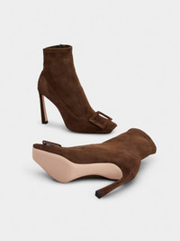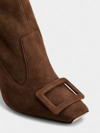 Characterized by the Trompette heel, with a slightly flared curved shape, these booties in suede combine character and refinement. Featuring an elastic bootleg and iconic covered buckle, they embody an elegant and contemporary femininity. FEATURES - Ovine suede - Covered buckle - Zip on the inside - Leather insole - Leather outer sole - Covered Trompette heel - Heel height 3.9 ins - Made in Italy RVW40143020YQ0S611