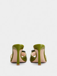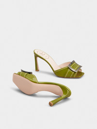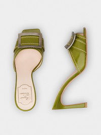 Characterized by the Trompette heel, with a slightly flared curved shape, these mules are crafted in patent leather, with exposed stitching. Complemented by the iconic metal buckle, they are the ally of an elegant and contemporary femininity. Description & details Patent calfskin leather Metal buckle Leather insole Leather outer sole Covered Trompette heel Heel height 3.3 ins Made in Italy Mod: RVW60342960TM6V221