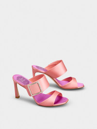 Characterized by a Trompette heel, with a slightly slanted curved shape, these double band mules are crafted in satin. Complemented by the iconic crystal buckle, they are the ally of an elegant and contemporary femininity. FEATURES - Silk blend satin - Crystal buckle - Satin insole - Leather outer sole - Covered Trompette heel - Heel height 3.3 ins - Made in Italy RVW45244410RS0M202