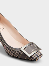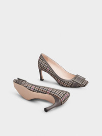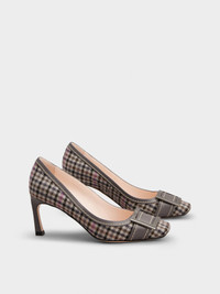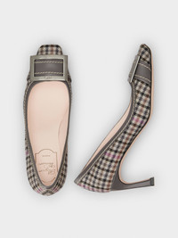 Inspired by the emblematic Belle Vivier buckle, these pumps feature a Trompette heel, with a slightly flared curved shape. Crafted in Prince of Wales fabric, leather inserts and contrasting stitching, they are the ally of an elegant and contemporary femininity. Description & details Fabric Prince of Wales pattern Leather inserts Metal buckle Leather insole Leather outer sole Covered Trompette heel Heel height 2.8 ins Made in Italy Mod: RVW40043100UN63L96