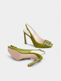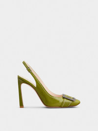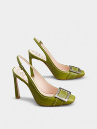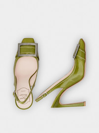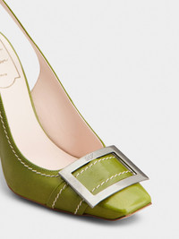 Inspired by the emblematic Belle Vivier buckle, these slingback pumps feature a Trompette heel, with a slightly flared curved shape. Handcrafted in patent leather, with exposed stitching, they are the ally of an elegant and contemporary femininity. Description & details Patent calfskin leather Metal buckle Leather insole Leather outer sole Covered Trompette heel Heel height 3.9 ins Made in Italy Mod: RVW40141430TM6V221