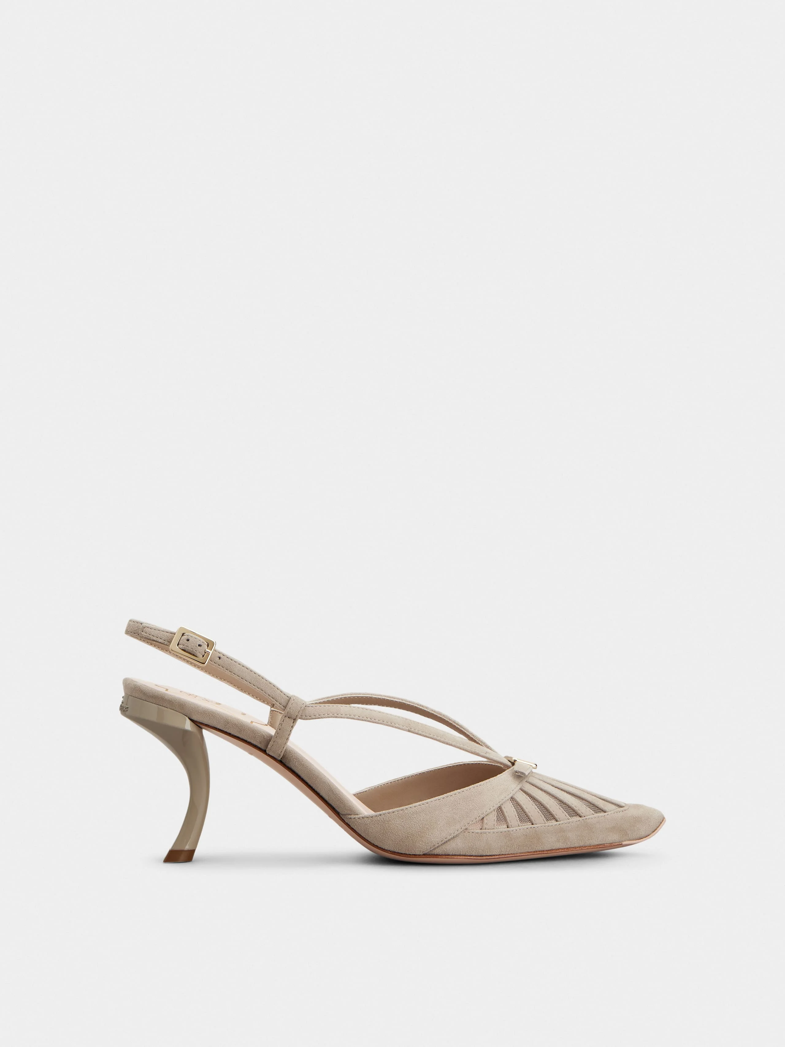 Launched in 1963, the Virgule heel is one of the Maison's most famous creations. Its bold curves combine comfort and elegance. These pumps in suede and mesh fabric, with a mini metal buckle, accompany you throughout the day with their sophisticated style. Description & details Suede Mesh fabric detailing Mini metal buckle on the front Heel strap Leather insole Leather outer sole Lacquered Virgule heel Heel height 3 ins Made in Italy Mod: RVW79943680MYP1V76