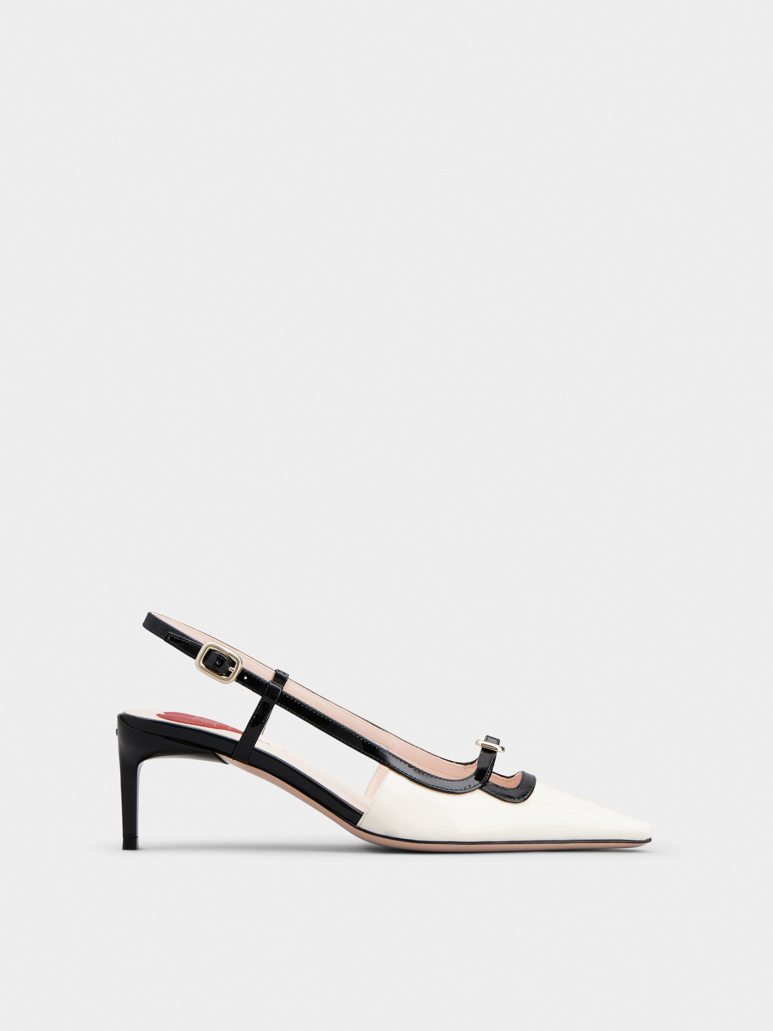 Crafted in shiny patent leather, the Viv’ Canard pumps are a mix of iconic elements. Inspired by a design from the Maison's archives, they are characterized by a square tapered toe. The straps come with the distinctive rounded mini buckle. The lacquered stiletto heel is embellished with the embossed Roger Vivier logo, while the insole is recognizable by the emblematic heart. Description & details Patent leather upper Squared tapered toe Decorative front strap Heel strap Leather insole with heart-shaped insert Lacquered heel 2.2 ins Leather outsole Maintenance and care cards included Branded dustbag Mod: RVW72237660D1P0H62
