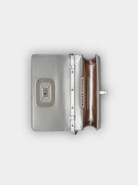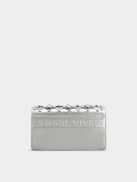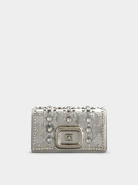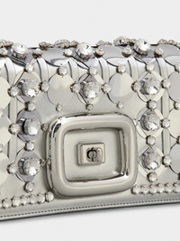 Feminine and sophisticated, Viv' Choc Bag is a new icon of the Maison. The Disco version, with crystal applications and maxi sequins, is inspired by the strobe lights of 1970s dance. Crafted in metallic leather, it features the distinctive shiny metal domed buckle. The Roger Vivier logo embellishes the bag's back pocket, which transforms into a clutch bag by removing the shoulder strap. Description & details Made in Italy Item crafted in hammered leather Maxi sequin applications 13 crystals 114 rhinestones Metal buckle Turn-lock closure Flat pocket on the back with embossed Roger Vivier logo Leather and fabric interior Internal pocket Dimensions: 8.3 x 4.5 x 2 ins, adjustable and removable shoulder strap Maintenance and care cards included Branded dustbag Mod: RBWAOGW4100H0VB200