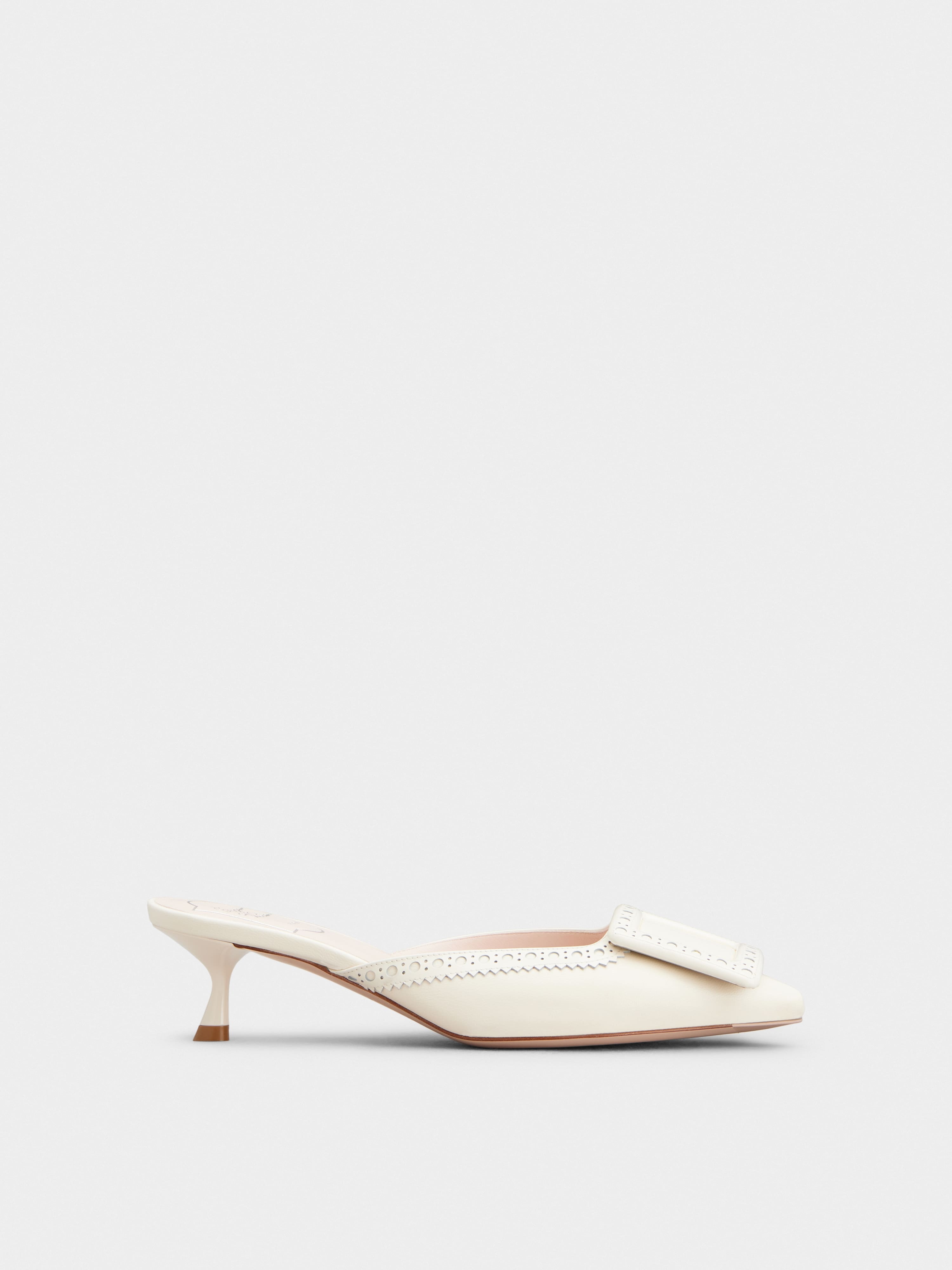 Modern and versatile, the Viv' in the City is characterized by a covered buckle and a stiletto heel. Crafted in nappa and smooth leather, with elegant perforations, these mules add the final touch to the metropolitan women's allure. Description & details Ovine nappa leather Calfskin leather inserts Covered buckle Leather insole Leather outer sole Stiletto heel Heel height 1.8 ins Made in Italy Mod: RVW54341340UACC019