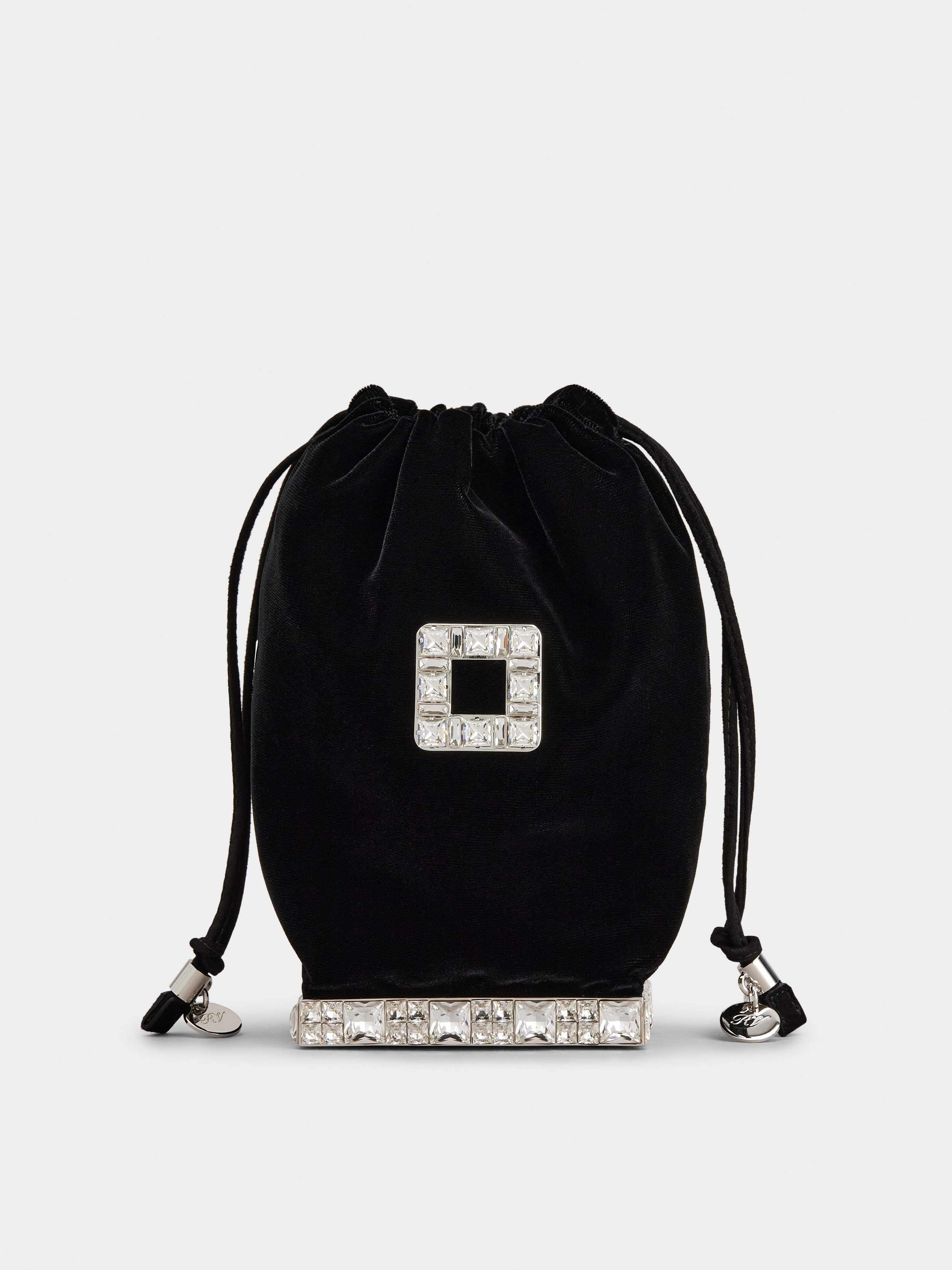 Featuring a metal base with crystals, the Viv' Pocket Strass Cube Bag is closed with a suede drawstring enhanced by branded metal charms. Crafted in soft velvet with the iconic crystal buckle, this alluring mini bag is completed by a concealed metal shoulder strap. An authentic jewel to wear on your arm. Description & details Made in Italy Item crafted in velvet Crystal buckle Metal base with crystals Roger Viver logo on the back Drawstring closure Braded metal charms Fabric interior Dimensions: 4.1 x 6.1 x 3.1 ins, suede drawstring/wristlet, metal shoulder strap Maintenance and care cards included Branded dustbag Mod: RBWANMK0100LVHB999