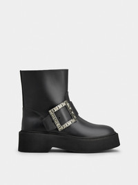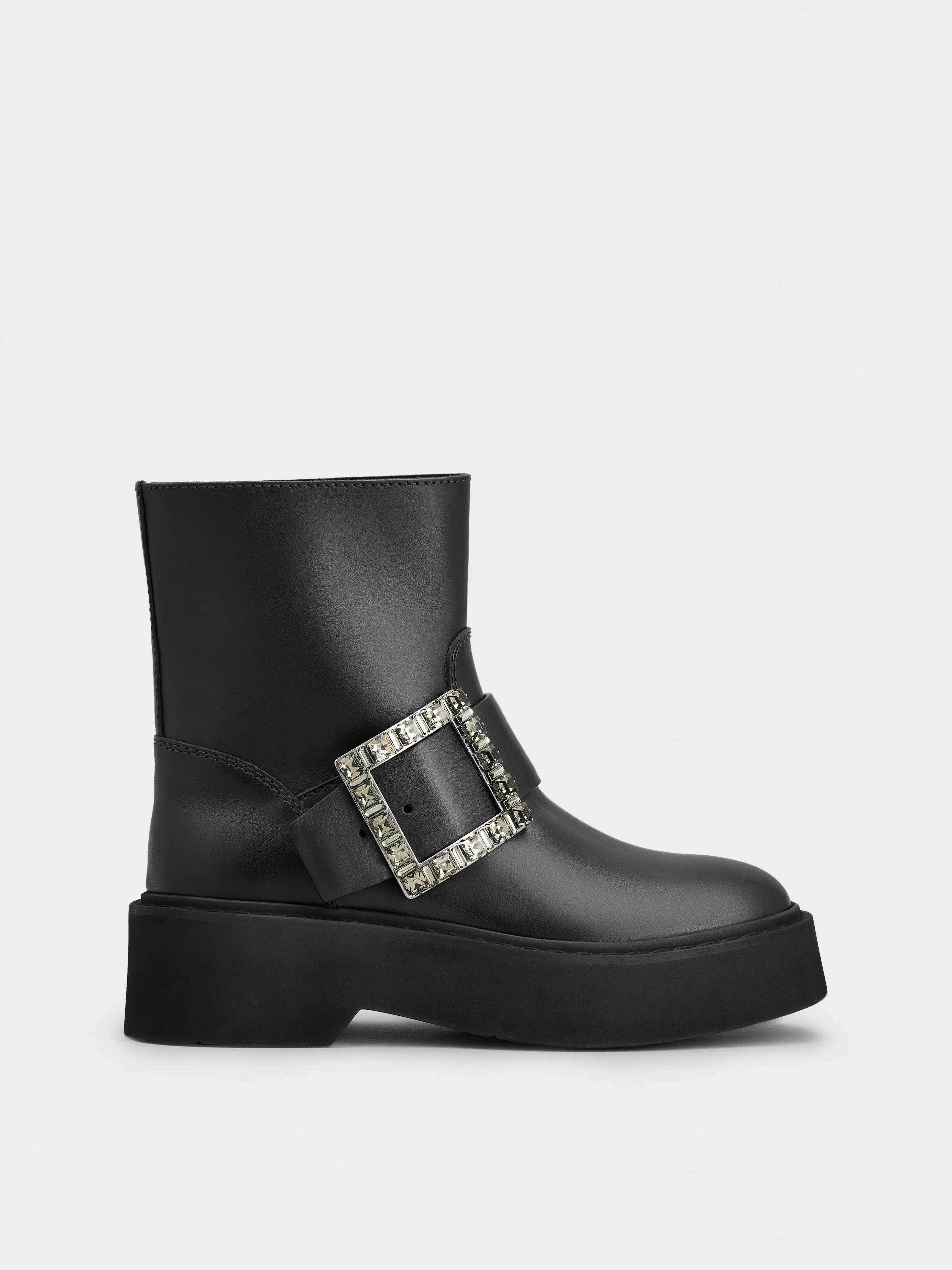 The Maison interprets the urban style with the Viv' Rangers collection. Crafted in leather, these high-soled booties are adorned with the iconic crystal buckle. Sophisticated and comfortable at once. Description & details Calfskin leather Crystal buckle Leather insole Rubber platform outer sole Made in Italy Mod: RVW74039630TTQB999
