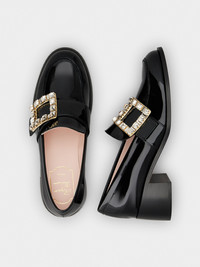 Timeless class and contemporary allure meet in these elegant loafers in patent leather, handcrafted. Featuring a medium heel and leather outer sole, they are adorned with the iconic crystal buckle. A true office look must-have. FEATURES - Patent leather - Crystal buckle - Leather insole - Leather outer sole - Heel height 2.2 ins RVW72437720D1PB999