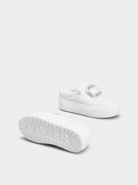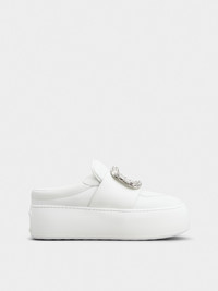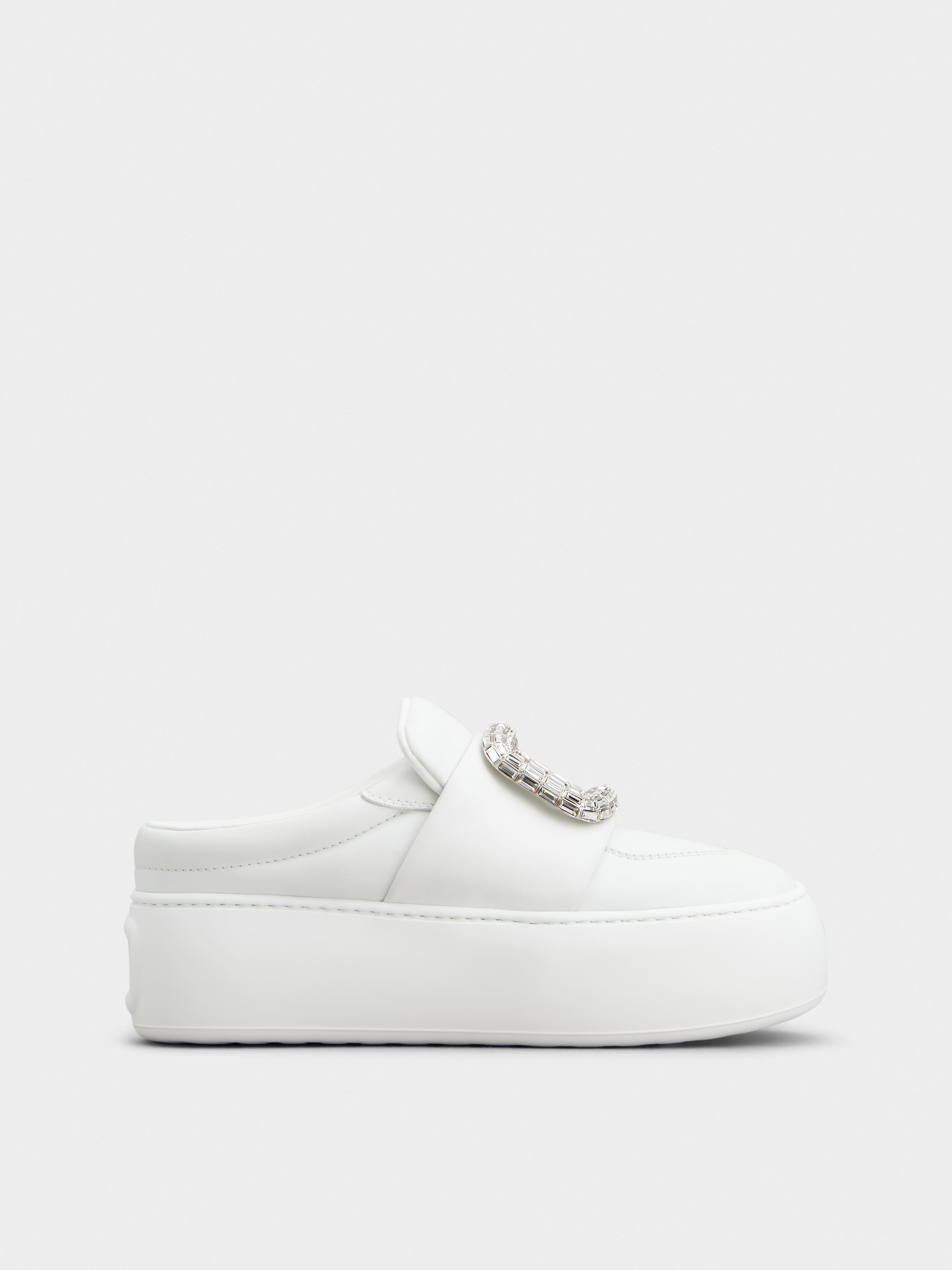 The new mules, inspired by the 60s Space Age, feature lightness and volume. Designed to feel like walking on cushions, they come with soft, rounded details and a crystal buckle. The 2 ins high outer sole is crafted in lightweight, flexible EVA, like yoga mats. The upper is crafted in ovine nappa leather, for ultimate comfort. A model that adds a contemporary Vivier touch to a casual look. Description & details Ovine nappa leather Crystal buckle Leather insole Rubber outer sole Outer sole height 2 ins Made in Italy Mod: RVW73941240LE9B001