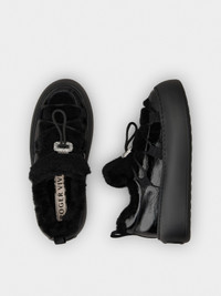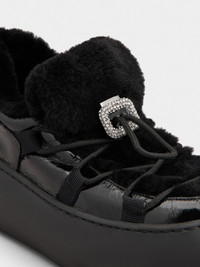 The new slip-on sneakers, inspired by the 60s Space Age, feature lightness and volume. Designed to feel like walking on cushions, they come with soft, rounded details. The 2 ins high outer sole is crafted in lightweight, flexible EVA, like yoga mats. The upper is crafted in patent leather and shearling, with a crystal buckle as a drawstring stopper. A model that adds a contemporary Vivier touch to a casual look. Description & details Patent leather Shearling inserts and lining Drawstring with crystal buckle Grosgrain detailing Rubber outer sole Outer sole height 2 ins Made in Italy Mod: RVW73943390US7B999