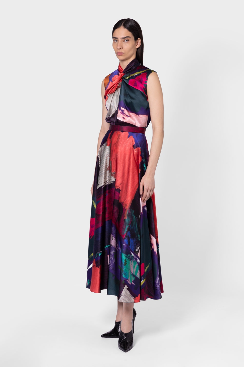 The AMEERA skirt features a bold abstract print in red, green and blue, offering a bold, artistic statement. This high-waisted circle skirt enhances the fluid movement of the fabric, creating a dynamic, elegant and flattering look. DETAILS & CARE Main Colour: Iris Pictorial print Product Fabric: Silk Satin Product Composition: 100% Silk Product Care: Specialist Dry Clean SIZING & FIT Model Wears: Size 8 Sizing System: UK Sizing