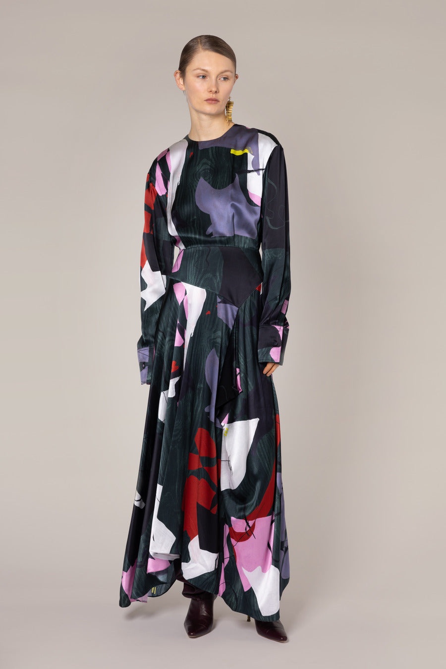 The ASTRID dress features an abstract print in deep greens, reds, purples, and pinks, creating a bold and artistic visual effect. The long cuffed sleeves and flowing skirt with an asymmetrical hem offer a fluid, elegant silhouette, while the tailored waist enhances the structure. DETAILS & CARE Main Colour: Peacock Product Composition: Silk Product Care: Specialist Dry Clean SIZING & FIT Model Wears: Size 8 Sizing System: UK Sizing