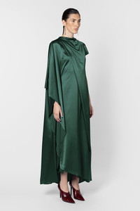 The HIBA dress in deep forest green is an elegantly draped mid length silk dress with a-symmetric styling. A cap sleeve to one side is complimented by a contrasting draped cape sleeve to the other. Model Wears: UK Size 8 Details & Care Main Colour: FOREST GREEN Product Fabric: SILK SATIN Product Composition: 100% SILK / 73% ACETATE 27% SILK Product Care: Specialist Dry Clean