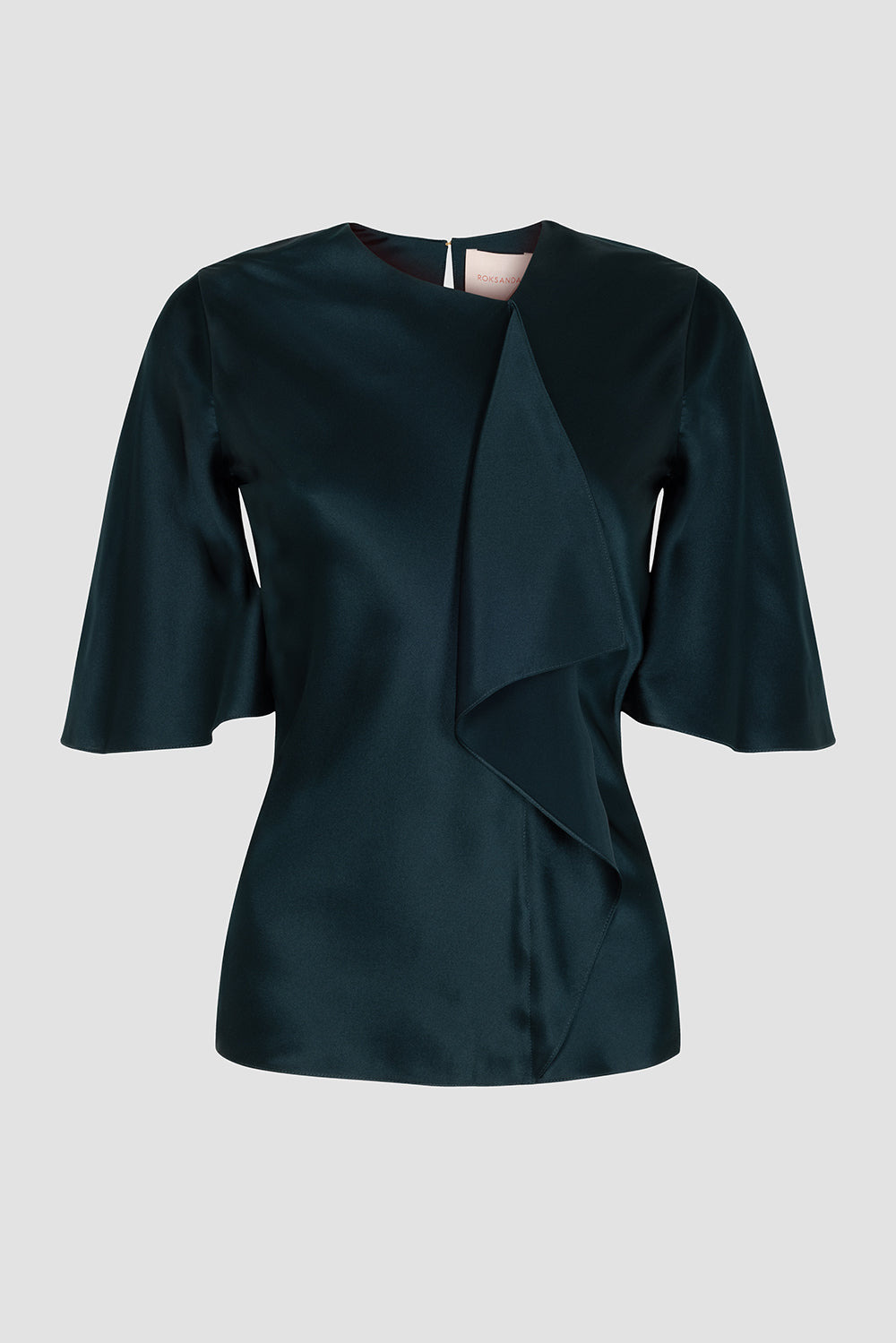 The NAIARA top is crafted from rich teal silk. It features a cascading asymmetric panel that adds dimension to its clean, structured silhouette. Its flowing short sleeves complement the tailored fit, making it a refined yet bold statement piece. Model Wears: UK Size 8 Details & Care Main Colour: DARK TEAL Product Fabric: Silk Sati Product Composition: 100% Silk Product Care: Specialist Dry Clean