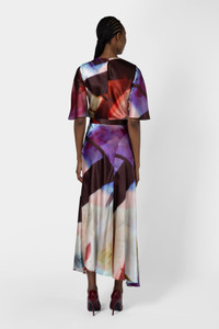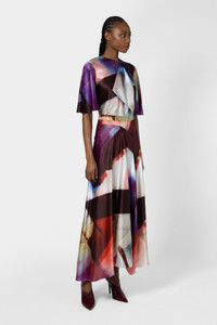 The NAIARA top is crafted from rich Satin Silk in multicoloured pattern. It features a cascading asymmetric panel that adds dimension to its clean, structured silhouette. Its flowing short sleeves complement the tailored fit, making it a refined yet bold statement piece. DETAILS & CARE Main Colour: Burgundy and Pink Photo Product Composition: Silk Product Care: Specialist Dry Clean SIZING & FIT Model Wears: Size 8 Sizing System: UK Sizing