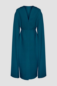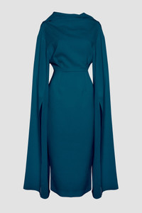 Form fitting and flattering, the NOUR dress in crepe features a high neckline with long draped sleeves. Its deep V neckline to the back offers sensual styling to the modest mid length. DETAILS & CARE Main Colour: Aegean Product Composition: Crepe Product Care: Specialist Dry Clean SIZING & FIT Model Wears: Size 8 Sizing System: UK Sizing