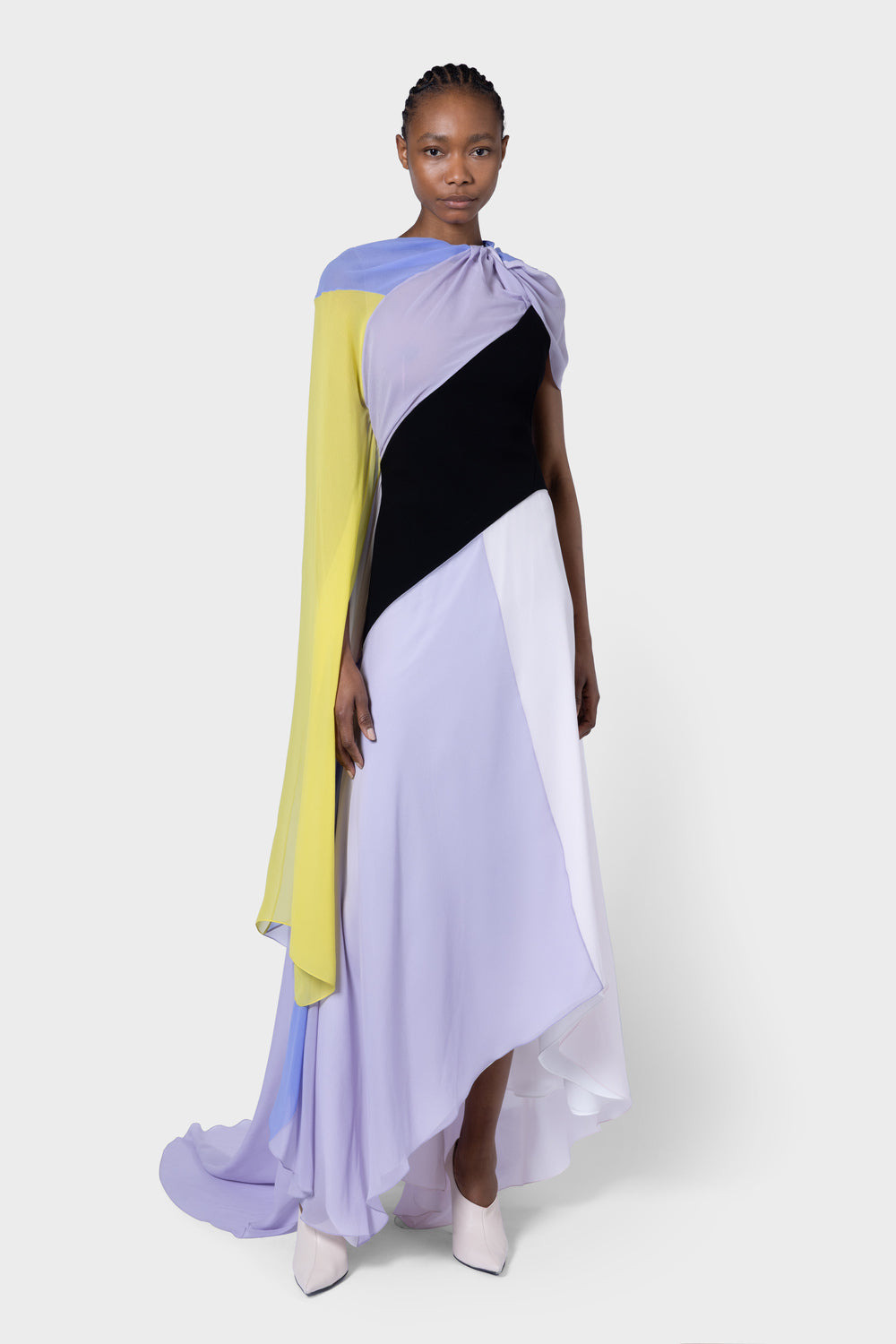 The OREL Dress is crafted in layers of silk crepe. Contrasting panels in hues of lilac and blue are punctuated with a pop of chartreuse, while the waist is defined by bold black. This floor length gown features gathered shoulder detail and an asymmetrical draped cape to the back. Model Wears: UK Size 8 Details & Care Main Colour: LILAC / BLACK / YELLOW Product Fabric: Crepe / Georgette Product Composition: 100% SILK, 68% ACETATE 32% POLYESTER, 73% ACETATE 27% SILK Product Care: Specialist Dry Clean
