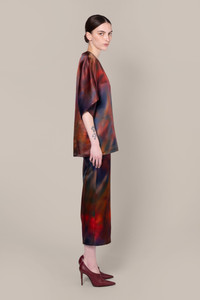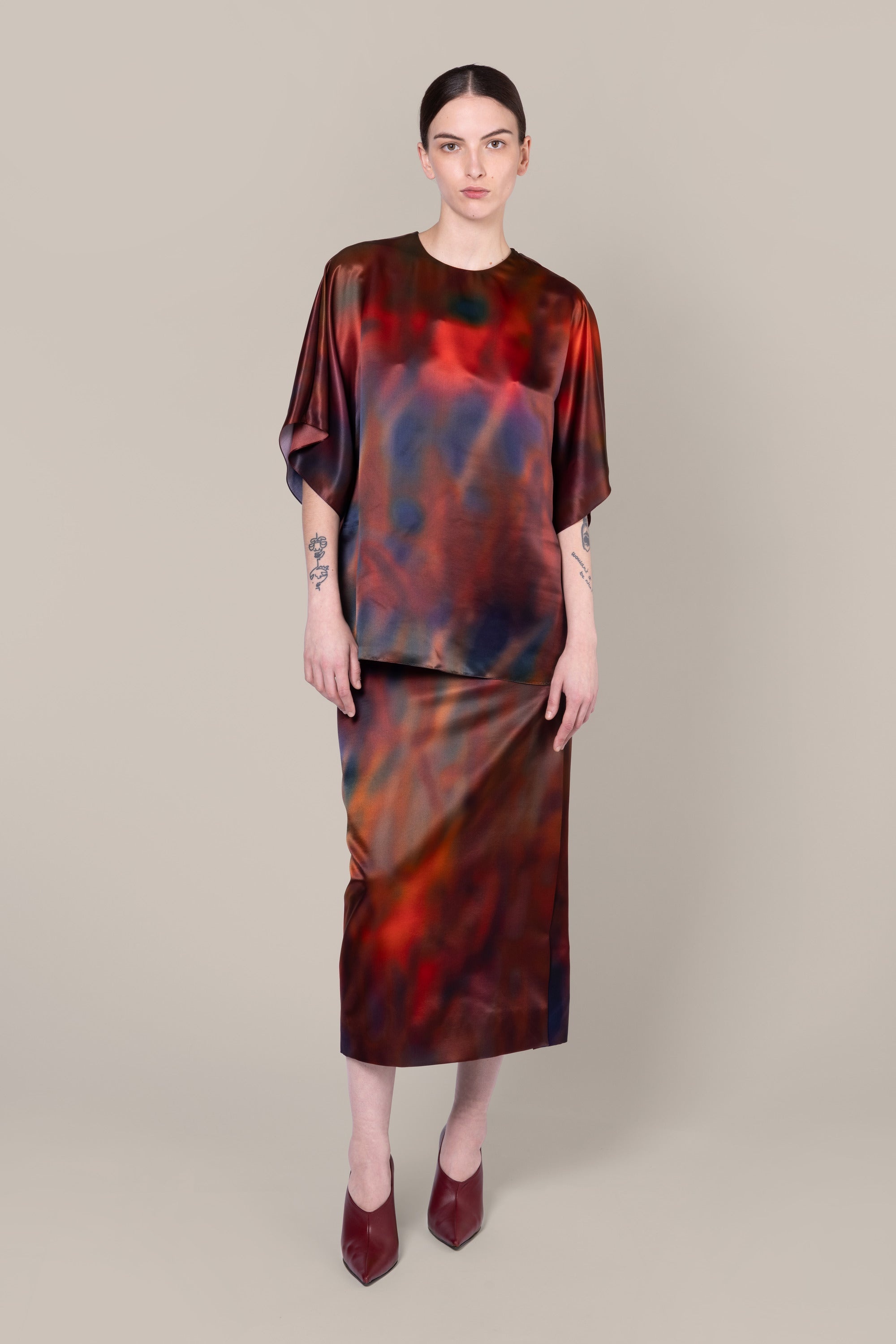 The VERSALA top features a mesmerizing sunset pattern in Hickory, creating a flowing visual effect. Its relaxed silhouette and lightweight fabric add effortless elegance to this unique piece. DETAILS & CARE Main Colour: Hickory Product Composition: Silk Product Care: Specialist Dry Clean SIZING & FIT Model Wears: Size 8 Sizing System: UK Sizing