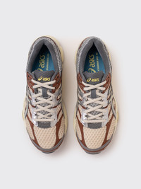 Color: Beige/Grey. Emmi a Japanese women’s apparel and yoga brand is defined by its understated, sporty-chic design language. Grey and beige mesh forms the base layer, paired with brown underlays and grey overlays. Light beige also highlights the sides and the GEL cushioning capsules underfoot, while the lining and outsole both arrive in soft grey.