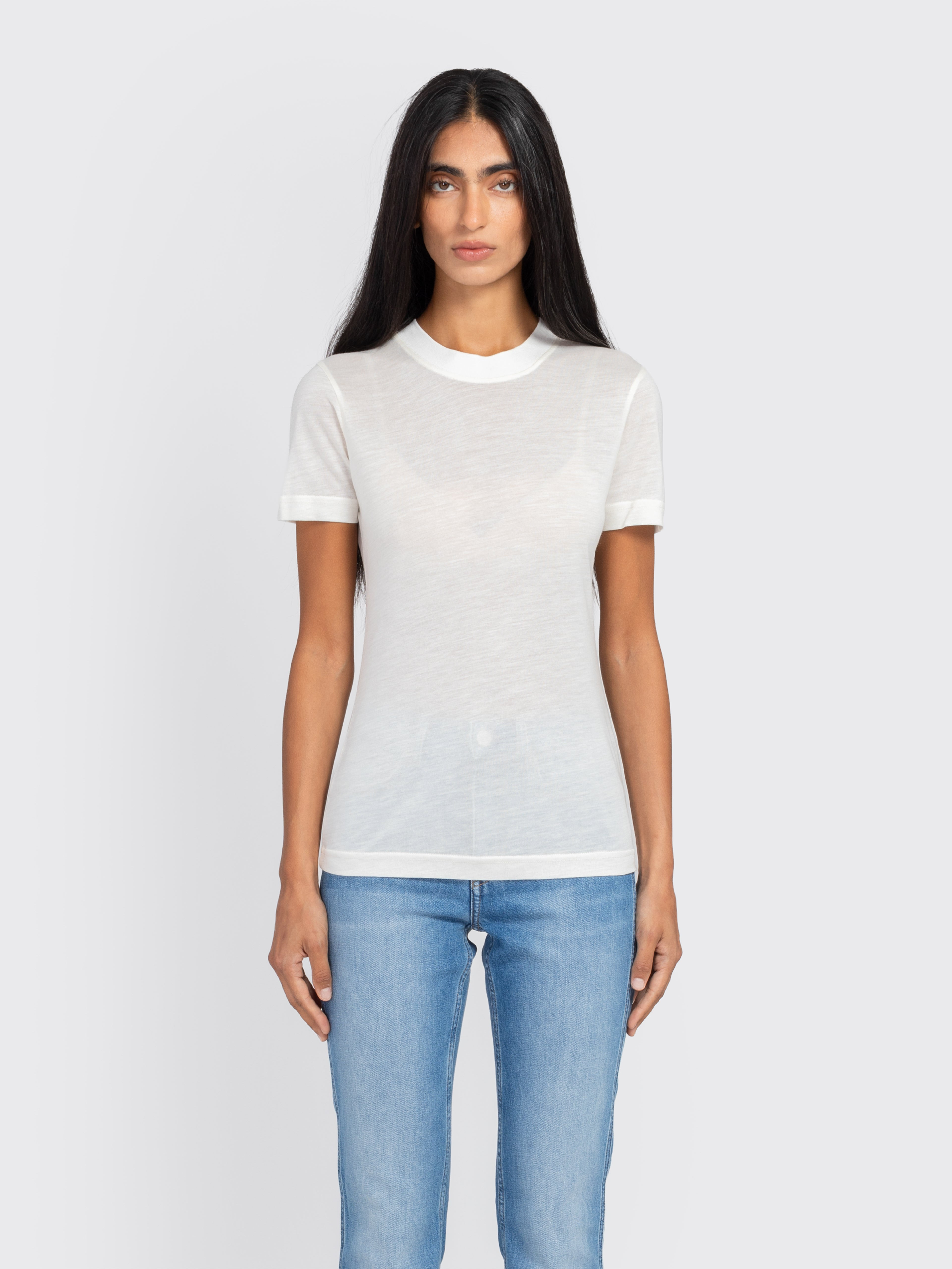 Color: Winter White. A slim fit tee in a lightweight and sheer lyocell cashmere blend jersey with a soft texture. A cosy base layer, it can also be styled with a skirt or denim on warmer days. 90% Lyocell (Lenzing), 10% Cashmere Made in Portugal Model is 5'8 and wears size XS.