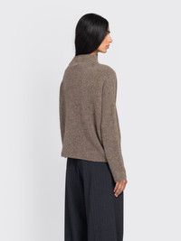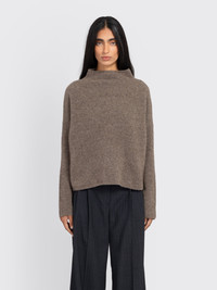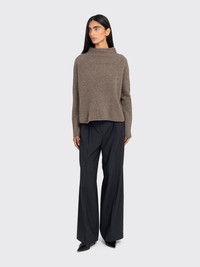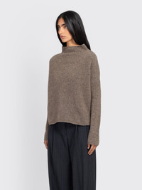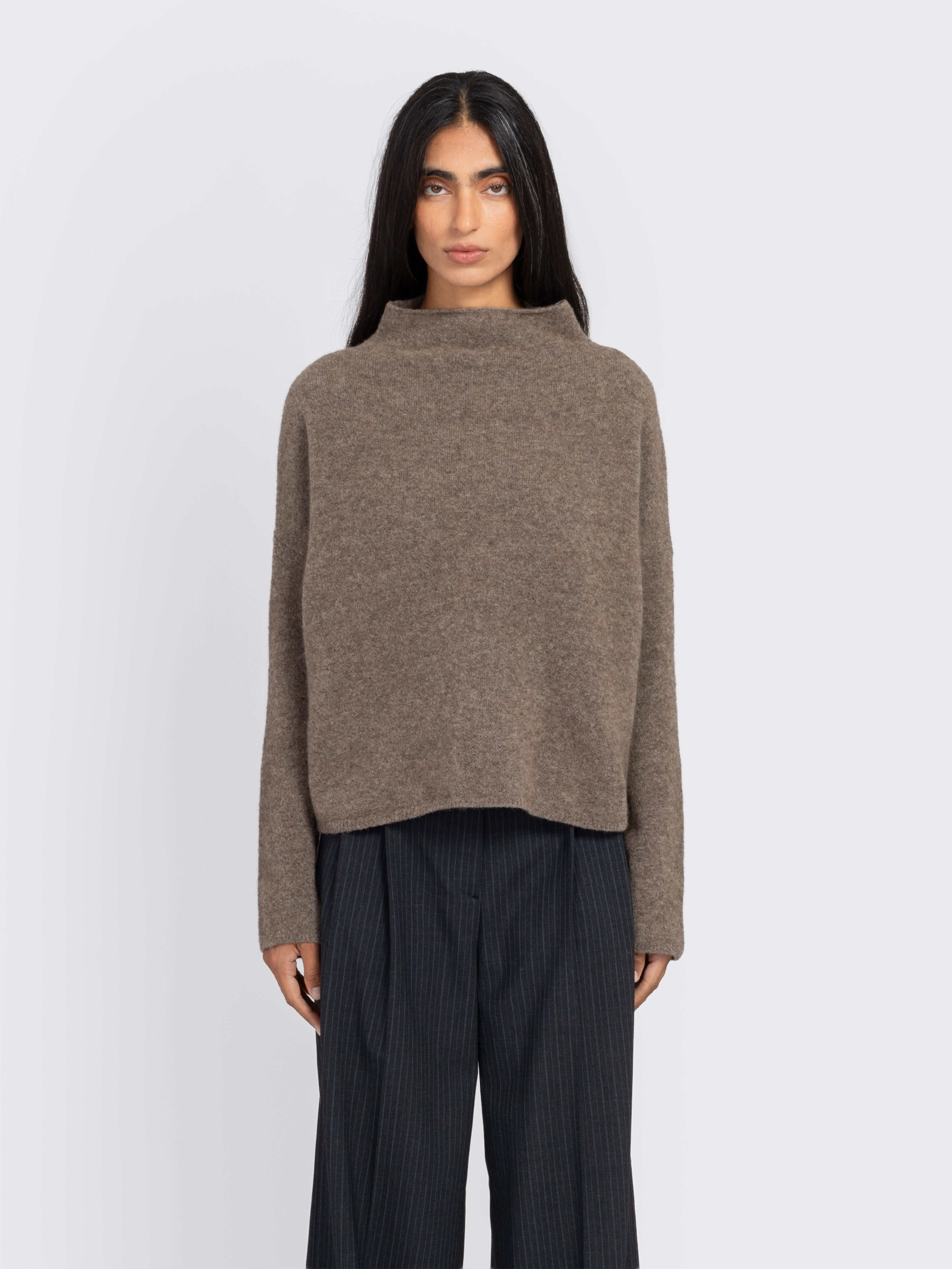 Color: Dark Taupe Melange. The Mika Yak Funnelneck Sweater has an oversized fit, knit from a soft yak wool blend. It has a high neck and dropped shoulder with a hip length. Throw it on over a tee and slim trousers, or wear it over the shoulders with a blazer. 54% Wool (RWS), 22% Yak Hair, 19% Polyamide (mech. recycled), 5% Elastane Made in Romania