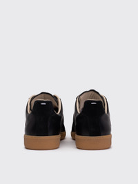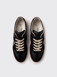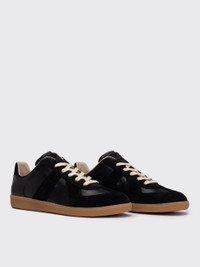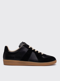Color: Black. The Replica sneakers in nappa leather and suede with a honey sole. The Maison's iconic Replica sneakers are inspired by Austrian sports shoes from the seventies. Details on the Replica pairs are continually reworked in line with the season's inspirations. - Upper: 100% calf leather - Contrast: 100% calf leather - Lining: 100% cotton - Sole: 100% rubber - Lace-up sneakers in nappa leather and crust leather - Contrasting sole - Maison Margiela logo label on the tab - White stitching at the back - Internal Replica label - Internal elastic - All-over Maison Margiela logo insole - Clean with a gentle leather cleanser Made in Italy