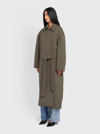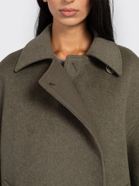 Color: Disruptive Moss. Produced in Italian melton fabric combining wool and polyamide, the women's Court Coat has an oversized fit and features dropped shoulders, a hidden placket with corozo buttons, wrap-around construction with waist belt, two welt pockets, and is fully lined for comfort and warmth. Model is 5'8 and wears size 36.