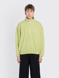 Color: Linden. Lightweight 100% virgin wool fleece sweater. · Stand collar · Half-zip closure · Zip pocket at chest · Elasticized hem and cuffs · Locker loop at back · Unlined Made in Austria. The Fleece outerwear embodies Rier's commitment to prevent micro plastics. Fabric and tailoring are made in Austria and feature mindfully selected details such as a half frontal metal zipper by Riri® with standing collar, chest pocket with security zipper and a completely unlined interior with elastic bottoms at bodice and cuffs for more wearing comfort and a sportive style. This 100% natural wool fleece - pile is biodegradable and requires reduced washes, is perfect for mid season and is ultra lightweight with a fluffy soft surface. Wool offers natural comfort by regulating the individual body temperature. Model is 6'4 and wears size L.